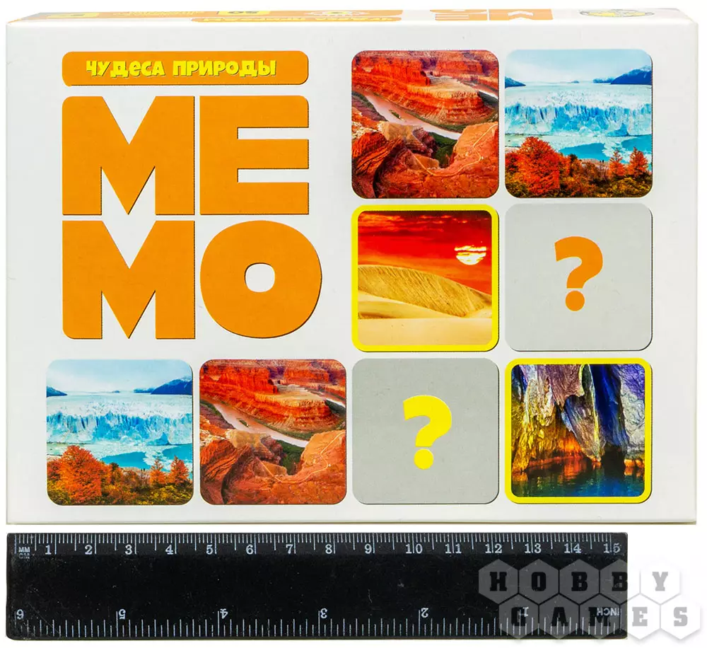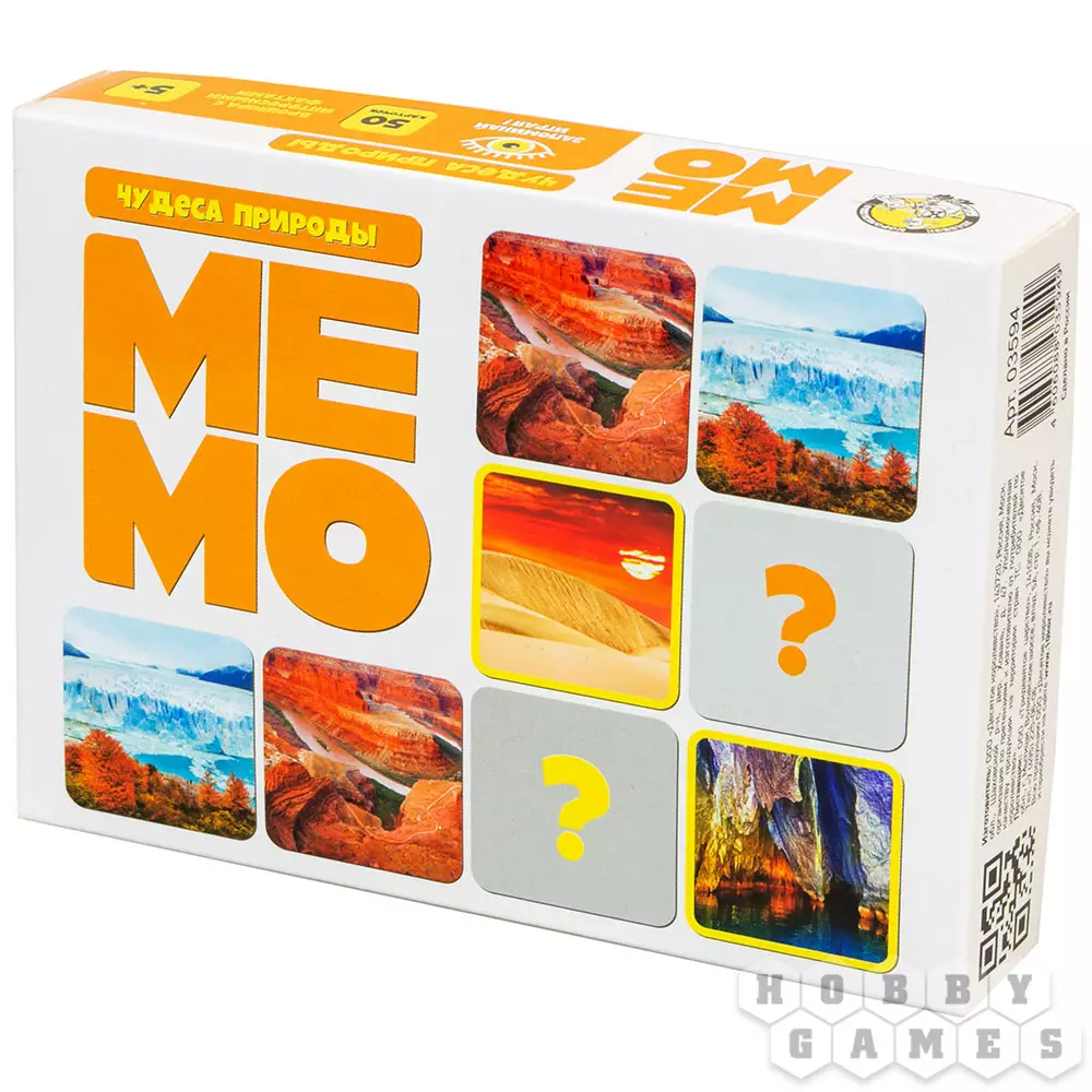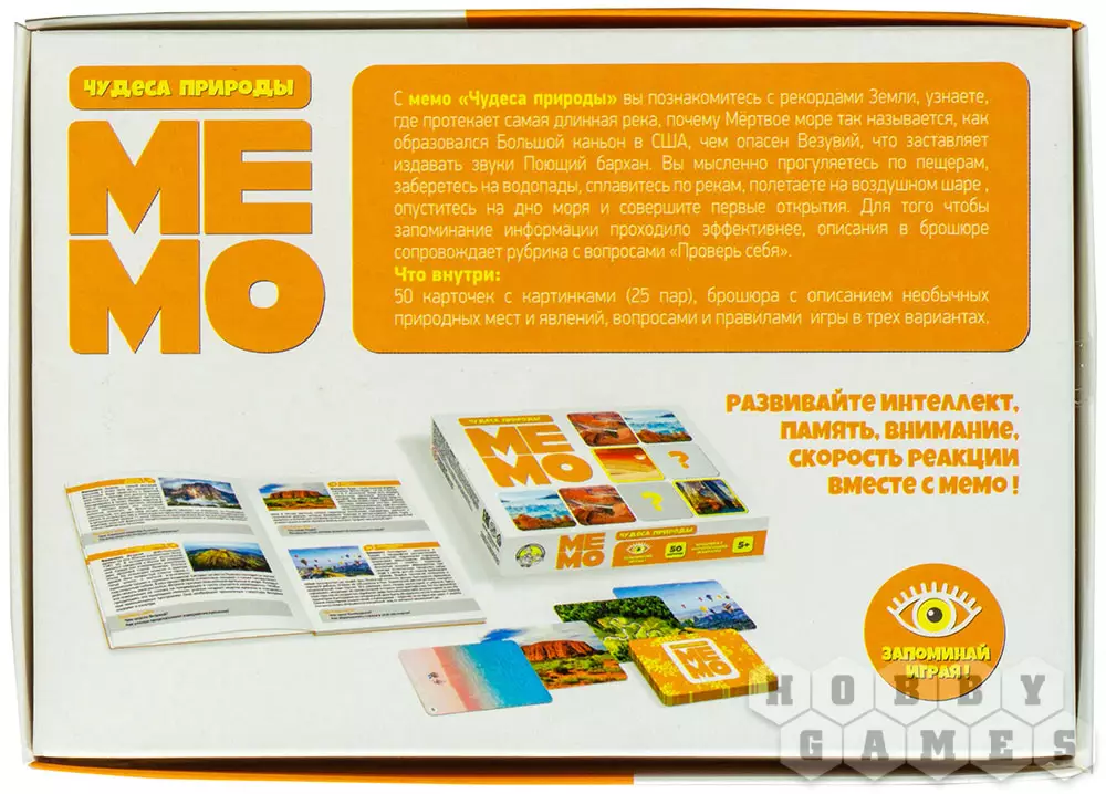 В игре "Мемо "Чудеса природы" вы найдёте парные карточки с изображением различных мест, являющимися своеобразными "рекордами" нашей планеты. Самый высокий водопад, крупнейший коралловый риф, высочайший вулкан, самая полноводная река – изучайте Землю, сидя за игровым столом! Также в коробке вас ждёт брошюра с подробным описанием всего, что представлено в игре. История возникновения, интересные факты и многое другое – каждый сможет узнать что-то новое, а также после прочтения проверить себя, ответив на несколько вопросов в конце каждого пункта брошюры.
