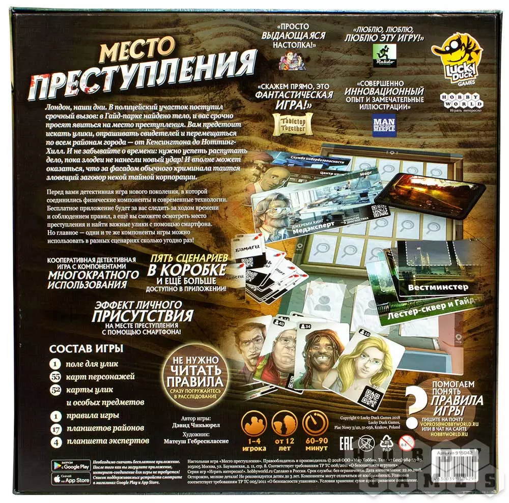 "Место преступления" – это уникальная на сегодняшний день настольная игра, которую можно отнести к кооперативным детективным играм. В этой игре вам предстоит взять на себя роли лондонских судебных экспертов и раскрыть несколько закрученных и остросюжетных дел… и тут вам поможет специальное приложение для планшетов и смартфонов, которое дополнит привычные игровые компоненты и игровой процесс частичкой виртуального мира. Современные технологии привносят что-то новое даже в такие привычные вещи, как настольные игры!