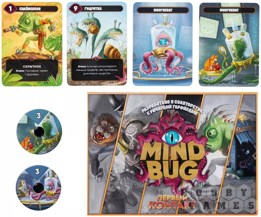 Игра начинается моментально – у каждого игрока уже есть готовый набор из десяти существ и два Мозгохвата. Вам не нужно собирать колоду или копить ресурсы: здесь нет слабых карт и неравного старта. Вы сразу же погружаетесь в гущу схватки, где всё решают ваши решения и умение предугадывать намерения противника. Единственная цель – первым свести три очка здоровья соперника к нулю!