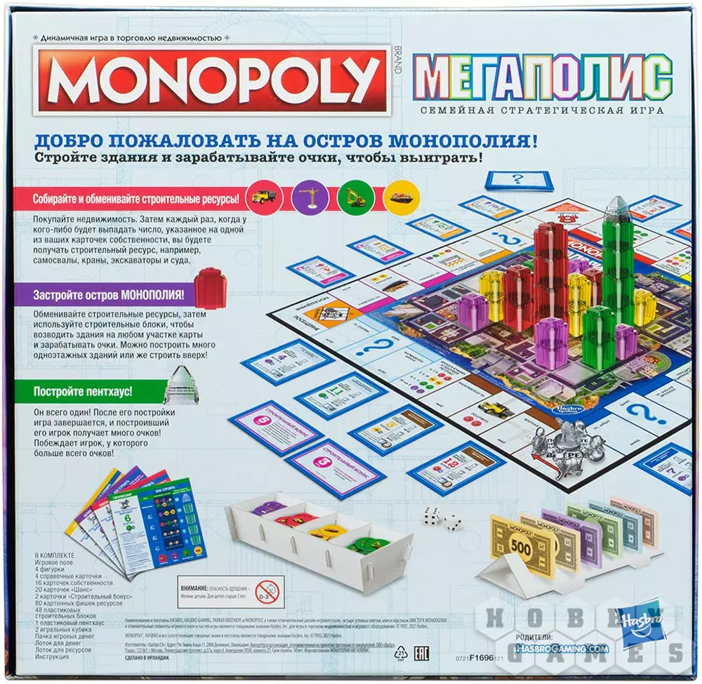 Добро пожаловать на остров Монополия! Рецепты выигрышных стратегий весьма просты – собирайте и обменивайте строительные ресурсы, покупайте недвижимость. Затем каждый раз когда у кого-либо будет выпадать число, указанное на одной из ваших карточек собственности, вы будете получать строительный ресурс, например, самосвалы, краны, экскаваторы и суда. Застройте остров – обменивайте строительные ресурсы, а затем используйте строительные блоки, чтобы возводить здания на любом участке карты и зарабатывать очки. Можно построить много одноэтажных зданий или же строить вверх! И, наконец, самая "изюминка" этой игры – пентхаус. Он всего один, и после его постройки игра завершается. Ну а игрок, который построил этот пентхаус получает в награду большое количество очков, что весомо повышает его рейтинг среди остальных финансистов.