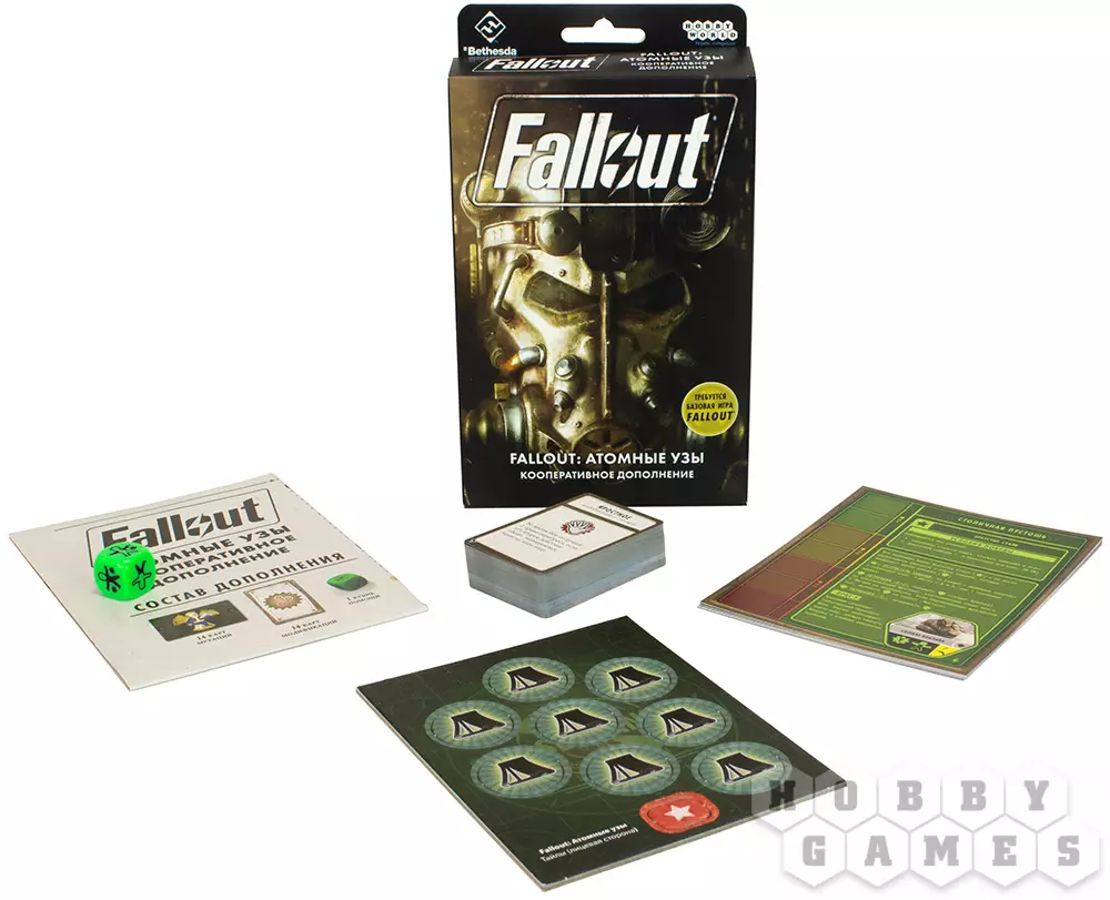 "Атомные узы" – набор к настольной игре Fallout и дополнению "Новая Калифорния”, который позволяет проходить все сценарии в кооперативном режиме, объединяя всех общей целью. Это дополнение также добавляет особые механики, от которых игроки получат новый игровой опыт. Предметы и оружие теперь можно модифицировать, полученная радиация может вызвать мутации, которые могут оказаться как полезными, так и вредоносными, а кубик помощи позволит вам помогать другим игрокам во время боя.
