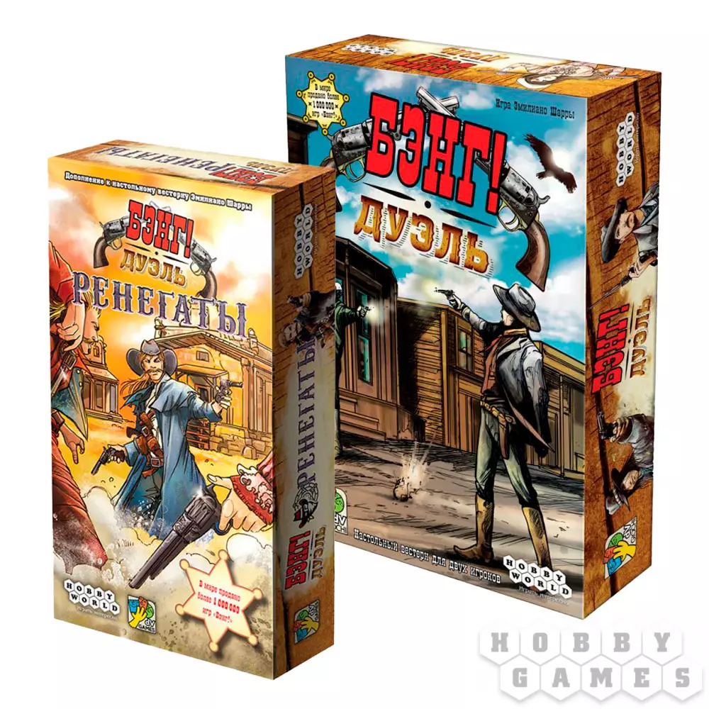 Набор включает в себя игру "Бэнг! Дуэль" и дополнение "Бэнг! Дуэль: Ренегаты" со скидкой 15%.