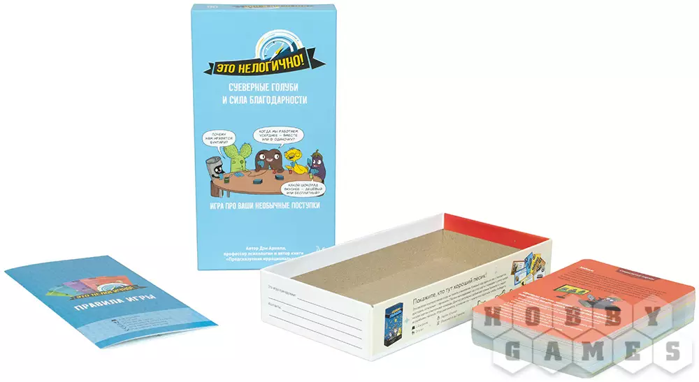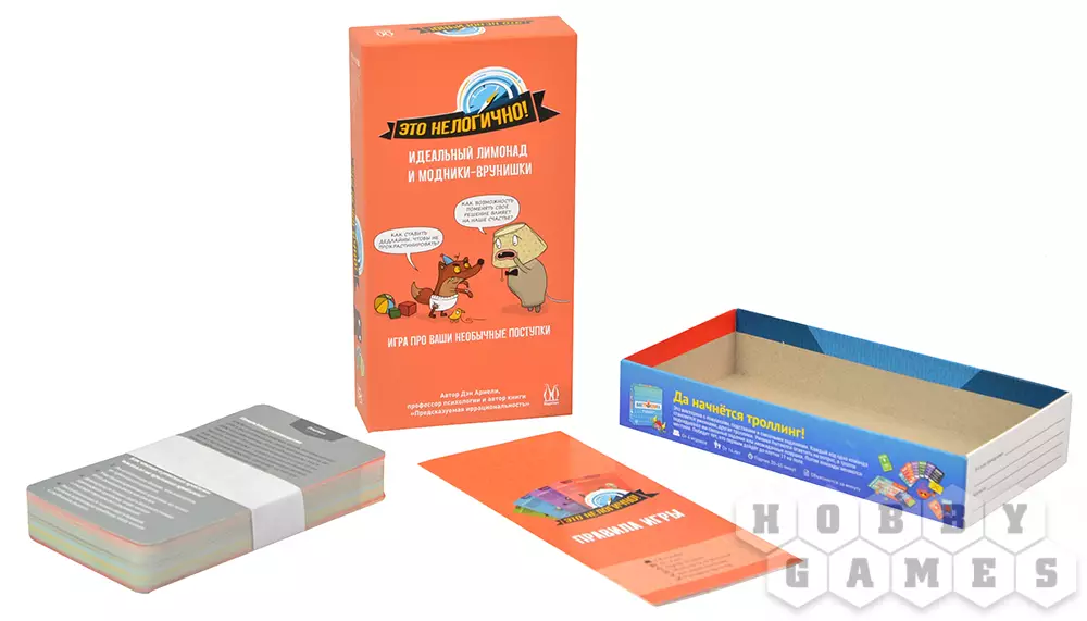 "Это нелогично!" – это локализация настольной игры Дэна Ариели, известного психолога и экономиста, а также научно-популярного лектора. Игра отлично подойдёт как для весёлой вечеринки (особенно вечеринки фанатов науки), так и для семейного досуга. Никакой конкуренции – игроки сообща решают, какой ответ правильный, а какой нет, делясь своими мыслями и достигая истины в дискуссии. Выберете три неправильных ответа – проиграете, а пятый правильный вариант приносит победу. Итак, какая таблетка плацебо лучше обезболивает, дешёвая или дорогая?