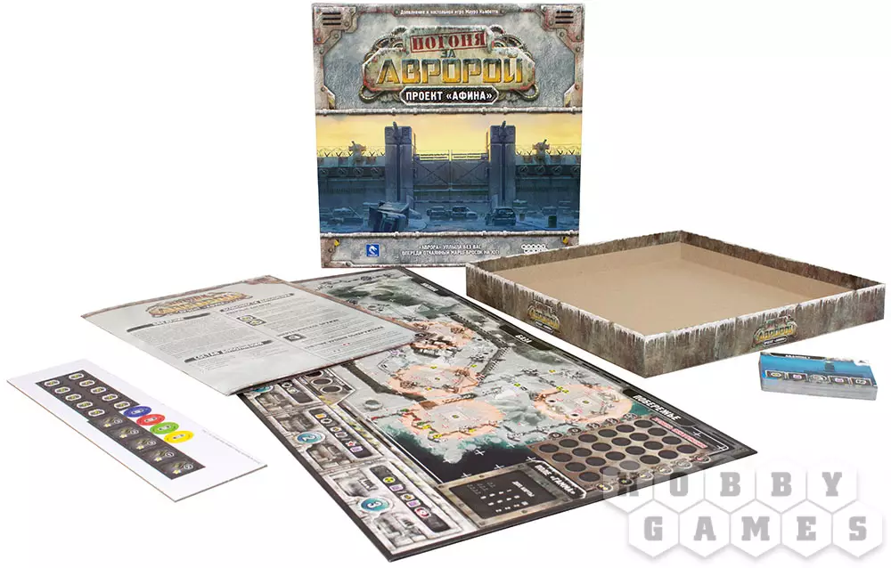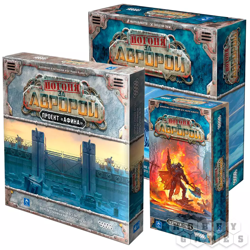 Набор включает в себя игру "Погоня за "Авророй"", дополнение "Погоня за "Авророй": Ледяная сталь" и дополнение "Погоня за "Авророй": Проект "Афина" со скидкой 15%.