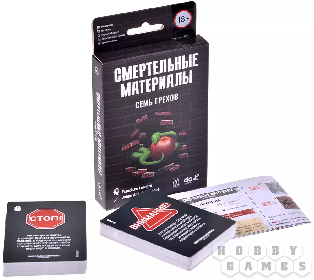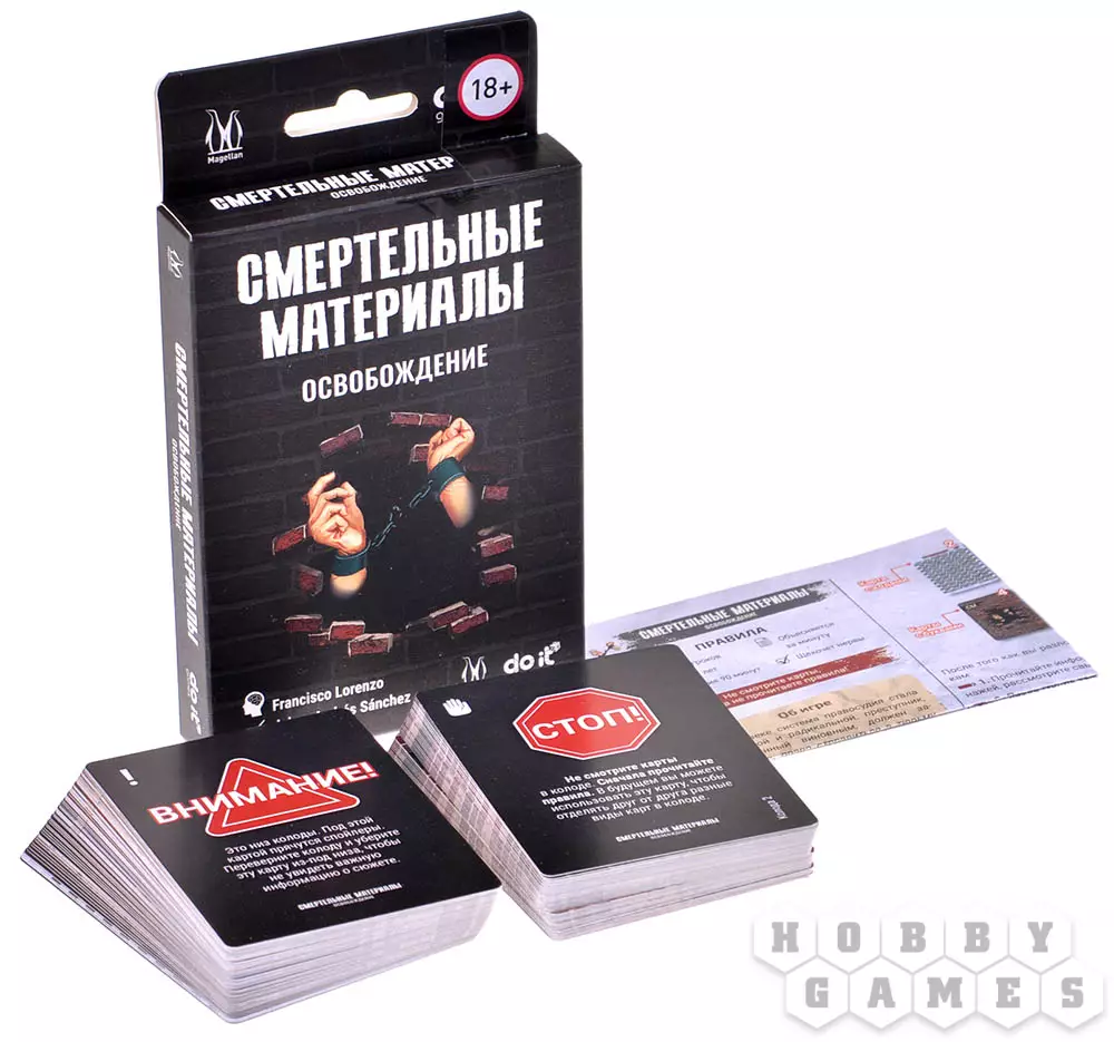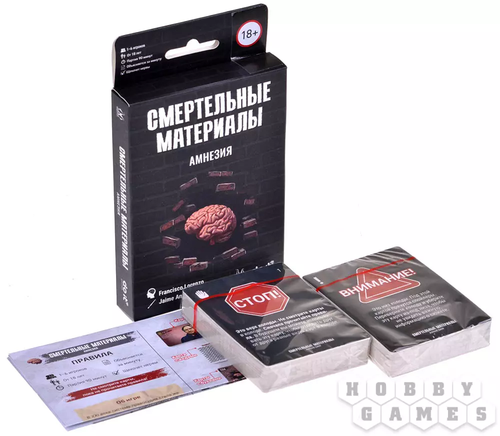 Настольная игра "Смертельные материалы: Амнезия" – это карточный детективный квест в лучших традициях жанра Escape Room (побег из комнаты). В начале игры 5 человек оказываются запертыми в необычной комнате: на их шеях ошейники, бьющие током, а память стёрта – они не помнят ничего ни о себе, ни друг о друге. Вам предстоит взять под управление всех героев сразу; вы будете решать логические загадки и головоломки, чтобы помочь "забывшимся" пройти все комнаты с испытаниями. Сможете сохранить жизнь им всем?