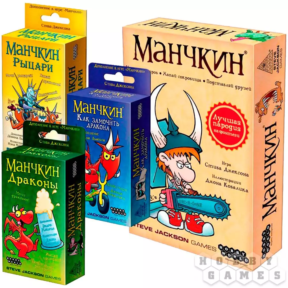 Набор включает в себя игры: "Манчкин", "Манчкин: Драконы", "Манчкин: Рыцари" и "Манчкин: Как замочить дракона" со скидкой 15%.