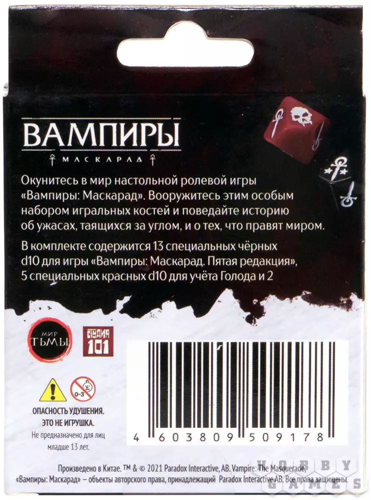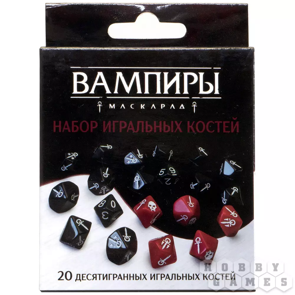 Этот набор кубиков, предназначенный для игры "Вампиры: Маскарад. Пятая редакция", позволит игрокам непринуждённо и легко влиться в атмосферу кошмара и ужаса, которым полнится мир игры. В комплекте вы найдёте 2 обычных кубика d10, а также 18 кубиков d10 с оригинальными символами игры от Paradox Interactive, среди которых 13 кубиков чёрного цвета для стандартных проверок навыков и 5 кубиков красного цвета, предназначенных для пула Голода. С ними ваши партии в "Вампиры: Маскарад" станут более аутентичными.