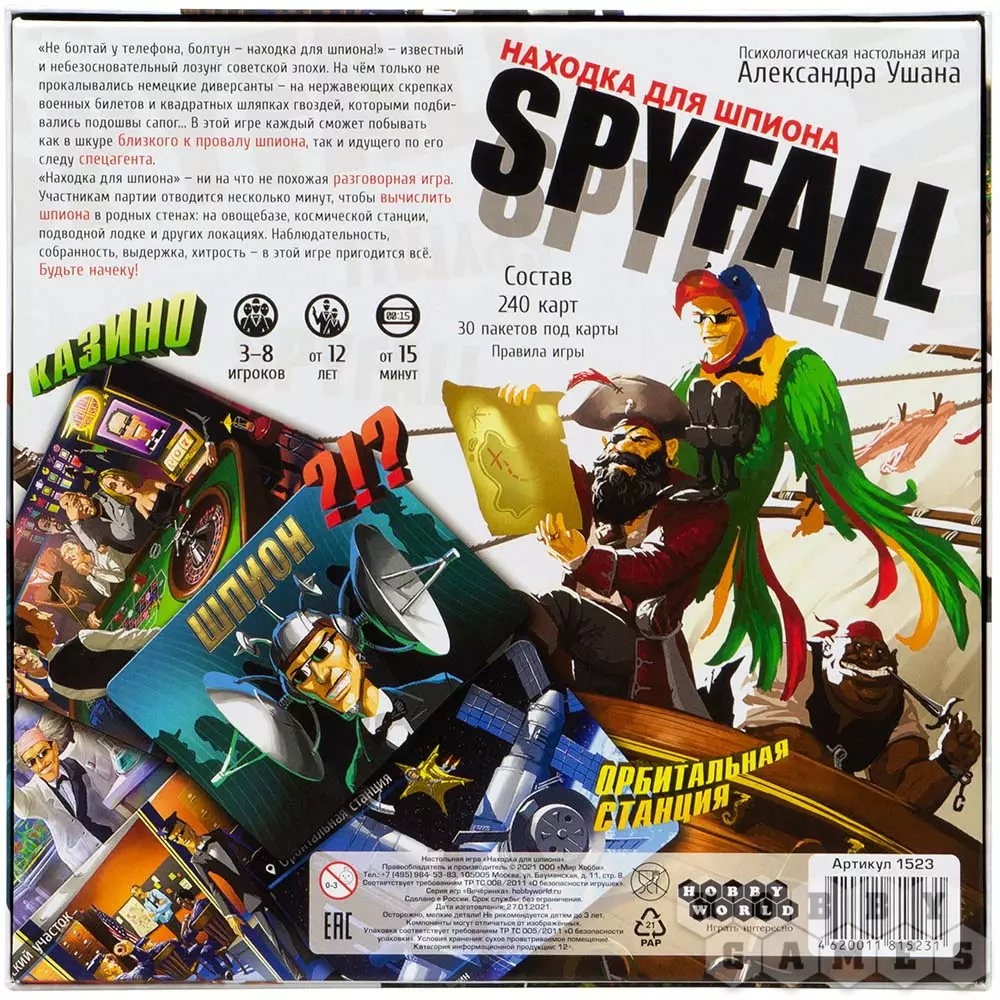 Самарцева26.01.2021 16:03Любимая настольная игра! Играем до 4-х утра, перебирая все локации. Нужно включать смекалку! Порой и одного вопроса хватает, чтоб шпион угадал локацию сходу. -