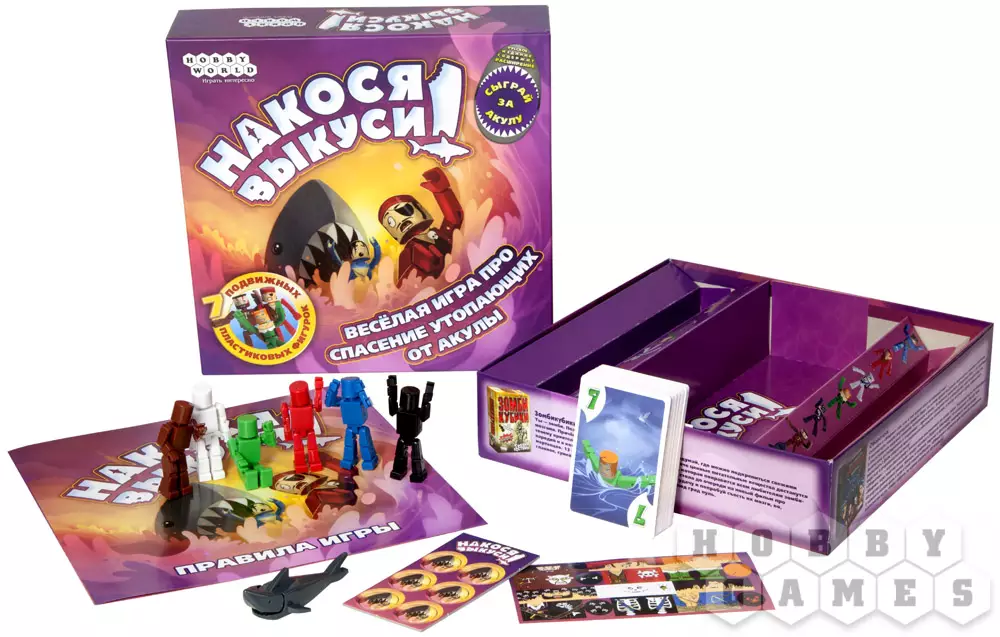 "Накося выкуси" – это быстрая динамичная игра для 2-7 игроков, которая придётся по душе и взрослым и детям. Водный антураж, забавные роботы-пираты и простые правила помогут скоротать время в поездке или разбавить семейный тихий вечер. В коробке вы также найдёте дополнение "Сыграй за акулу", с помощью которого один из игроков может принять сторону зла и стать акулой. Водные просторы ждут вас!