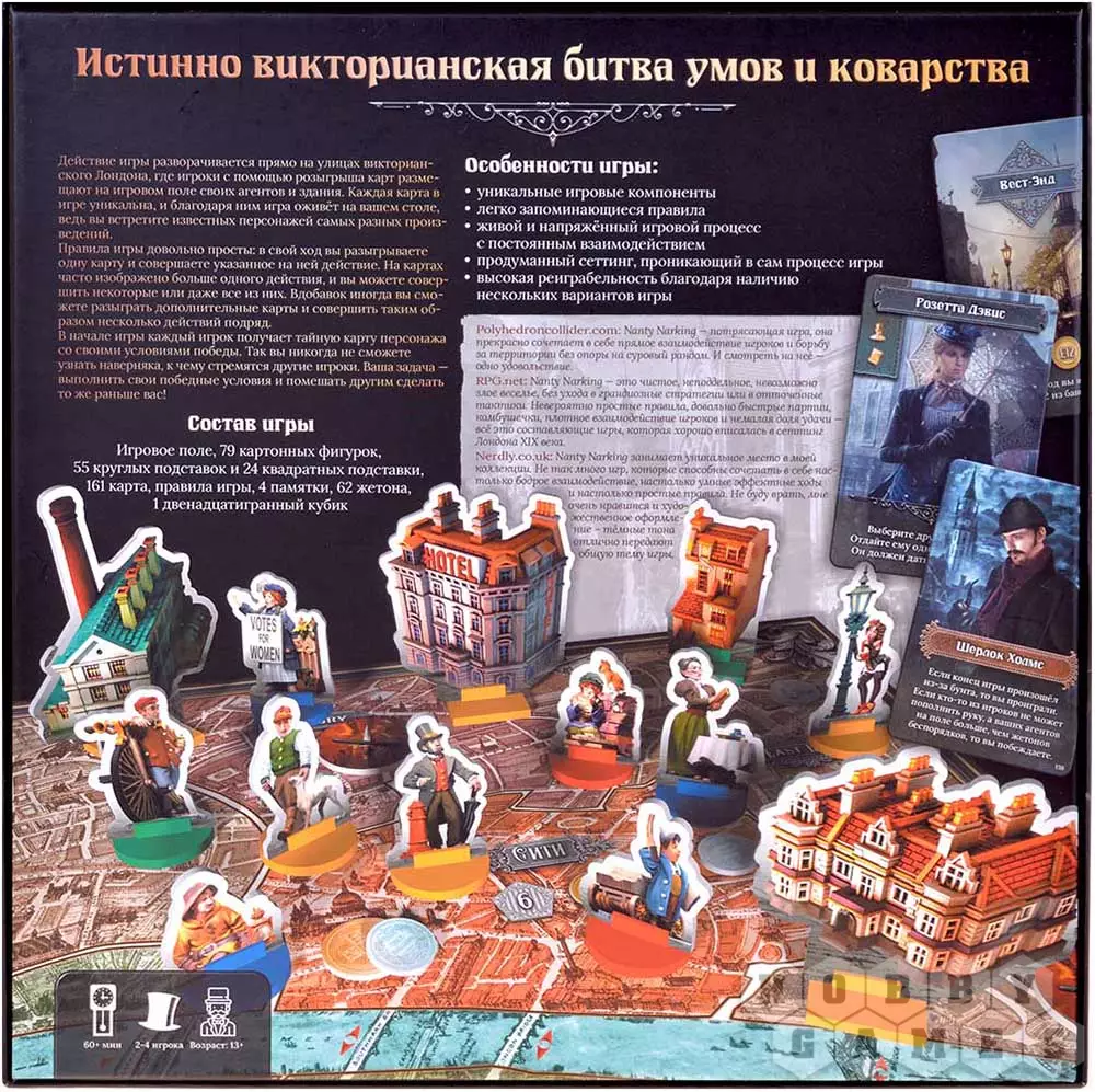 Игра наполнена отсылками к литературе Диккенса и Дойла, а также к городской культуре Лондона – тут вам и плоды промышленной революции, и суфражистки, и даже Джек-Потрошитель! Задействуя колоритных персонажей, распространяя влияние по районам и устраняя недоброжелателей, вы будете приближаться к господству в Лондоне – но будьте осторожны! Никогда нельзя быть уверенным, что у оппонента в рукаве не припасён козырь…
