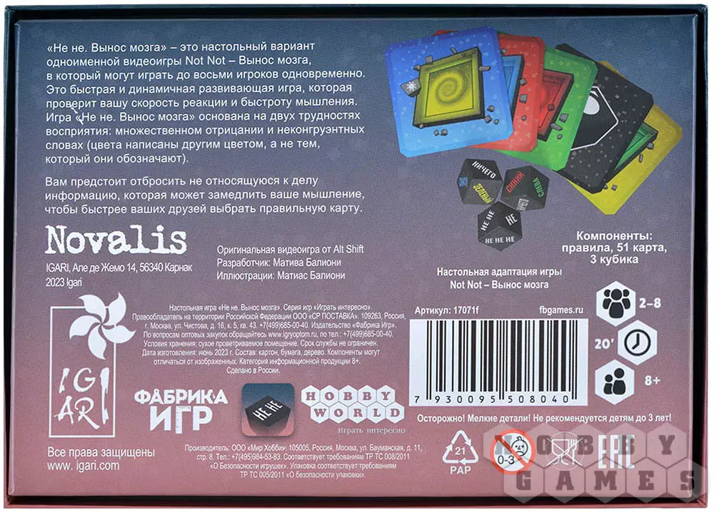"Не не. Вынос мозга" – это взрывающая мозг настольная игра на логику, скорость реакции и мышление. Настолка создана на основе пользующейся популярностью видеоигры Not Not A Brain-buster. Вам придётся напрячь голову, чтобы быстрее всех найти карточки, подходящие под перманентно меняющиеся цели.