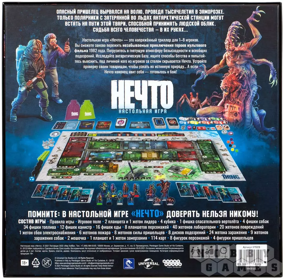 "Нечто. Настольная игра" – это полукооперативный триллер по мотивам культового фильма ужасов Джона Карпентера. Создатели игры стремятся как можно ярче передать атмосферу паранойи и отчаяния, царящие на станции "Аванпост-31". Одному игроку предстоит взять на себя роль пришельца и постараться улететь со станции, остальным – не дать ему это сделать, вооружившись огнемётами, коктейлями Молотова и другими интересными аксессуарами.