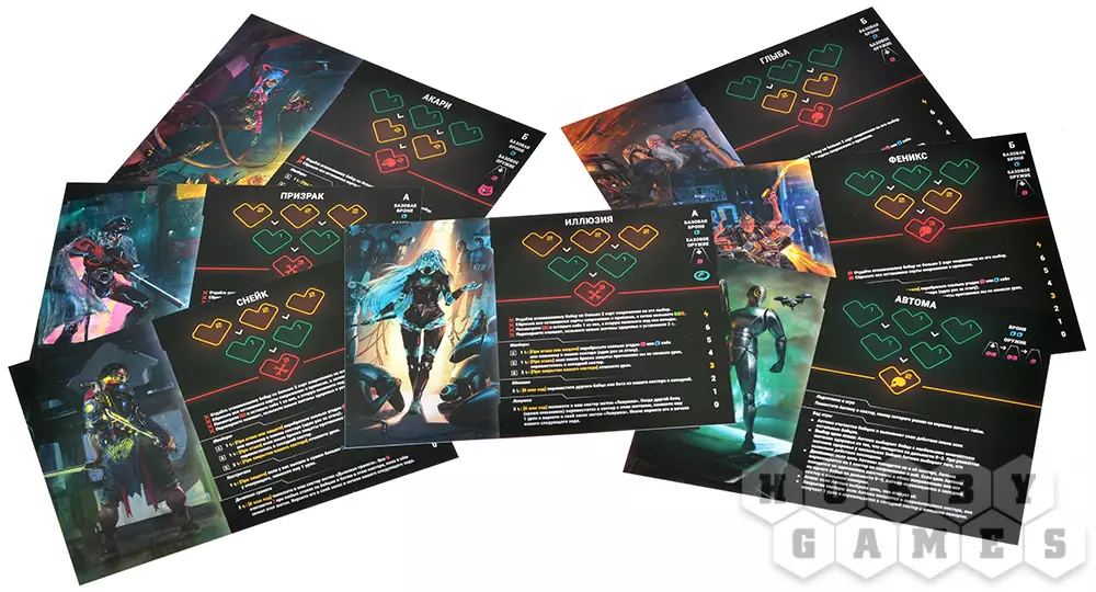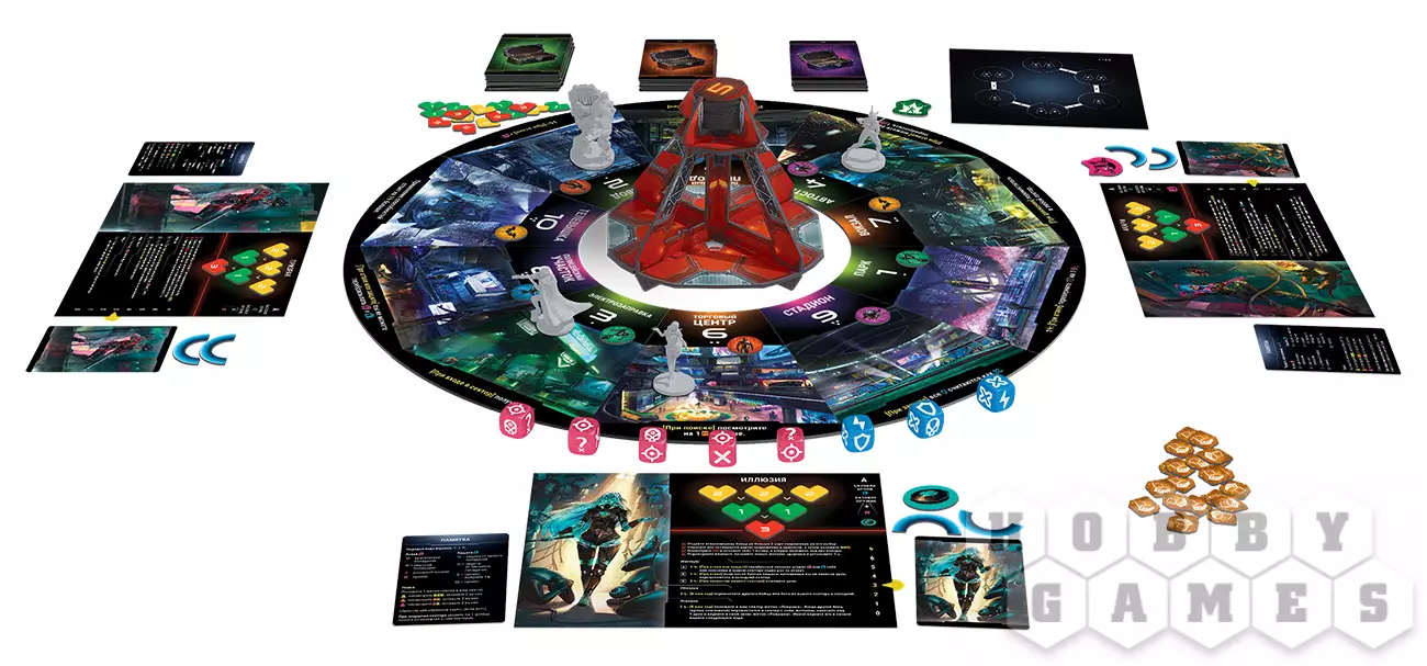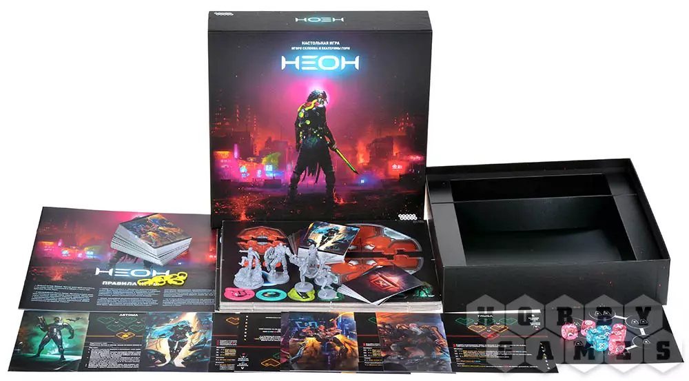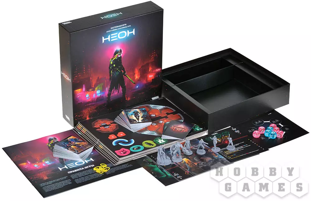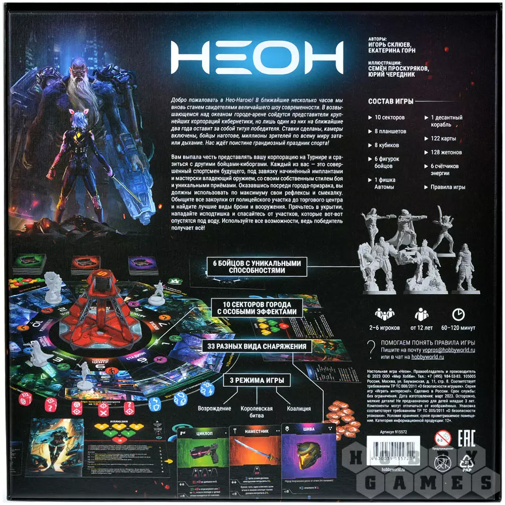 "Неон" – это настольная игра в жанре киберпанк, основанная на механике "королевской битвы". Во время игры поле будет постепенно уменьшаться, вынуждая оппонентов приближаться друг к другу, идти на риск и принимать ответственные решения прямо на ходу. Вы будете перемещаться по районам Нео-Нагои, собирать новые виды оружия и брони, планировать действия и перемещения.