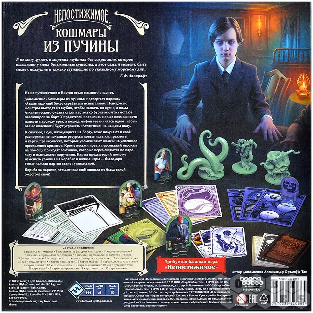 Перед вами дополнение к игре "Непостижимое", которое сделает испытания на борту парохода "Атлантика" ещё более суровыми. Приготовьтесь к столкновениям с чудовищами, живущими на дне Атлантического океана, и к новым видам диверсий со стороны предателей, затаившихся на корабле. Колода мифов, а значит, и количество угроз, расширилась вдвое. Впрочем, пассажиры также получат ряд преимуществ: новые предметы, навыки и карты преимуществ помогут им справляться с кризисами. К битве присоединится восемь новых персонажей, а вместе с ними и союзники – неигровые персонажи, которые смогут перемещаться по кораблю и выполнять важные поручения. Также дополнение порадует картами предысторий: это значит, что каждую партию ситуация на корабле будет меняться, гарантируя уникальный игровой опыт. В общем, вас ждёт ещё больше захватывающих приключений и ярких эмоций!