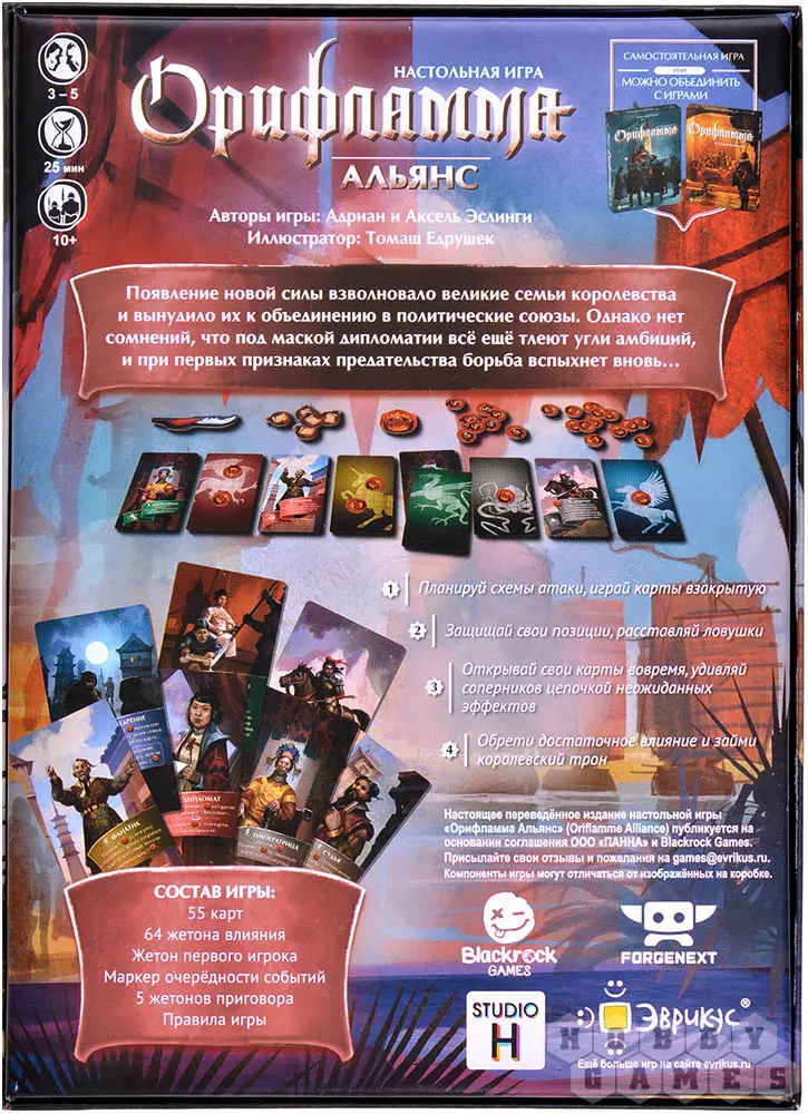 "Альянс" – это третья часть серии "Орифламма", посвящённой дворцовым интригам. Атмосферу европейского средневековья разбавили пёстрые краски востока, но пусть смена обстановки вас не обманет: простора для махинаций и интриг здесь ещё больше, чем в предыдущих играх. Основное нововведение "Альянса" – инструменты для заключения союзов с другими игроками. Обменивайтесь победными очками, делайте предложения и объединяйтесь – но не забывайте, что победителем может выйти только один! Искушённые интриганы найдут много интересных способов стравить оппонентов друг с другом и добиться своего необычными комбинациями. Чтобы углубить игровой процесс, в "Альянсе" также введена механика резервирования: теперь вы можете откладывать карты перед собой, чтобы получать новые преимущества.