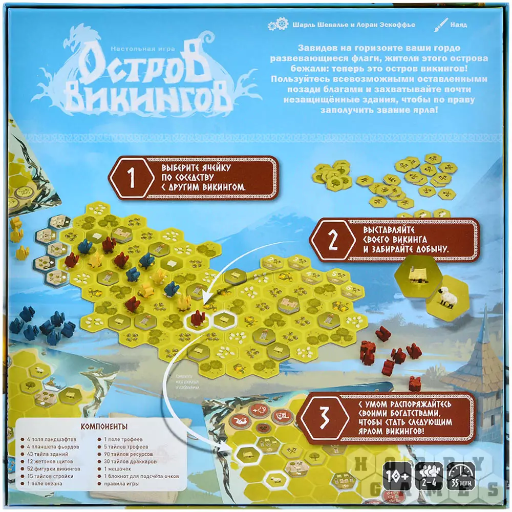 "Остров викингов" – стратегическая настольная игра, в которой вы возглавите клан отважных викингов, готовых бороться за господство на новом месте. Здесь каждый ваш ход – сражение между расчётом и жадностью, между хитрым планом и смелым риском. Игроки становятся вождями кланов, стремящихся захватить остров: штурмуют здания, собирают ресурсы, развивают свои фьорды и наполняют драккары добычей. Уникальная механика планирования действий и размещения жетонов даёт простор для стратегий, а яркие компоненты и визуальное оформление погружают в атмосферу северной саги. Вас ждут насыщенные партии, где вы будете строить, грабить, хитрить и бороться за титул ярла.