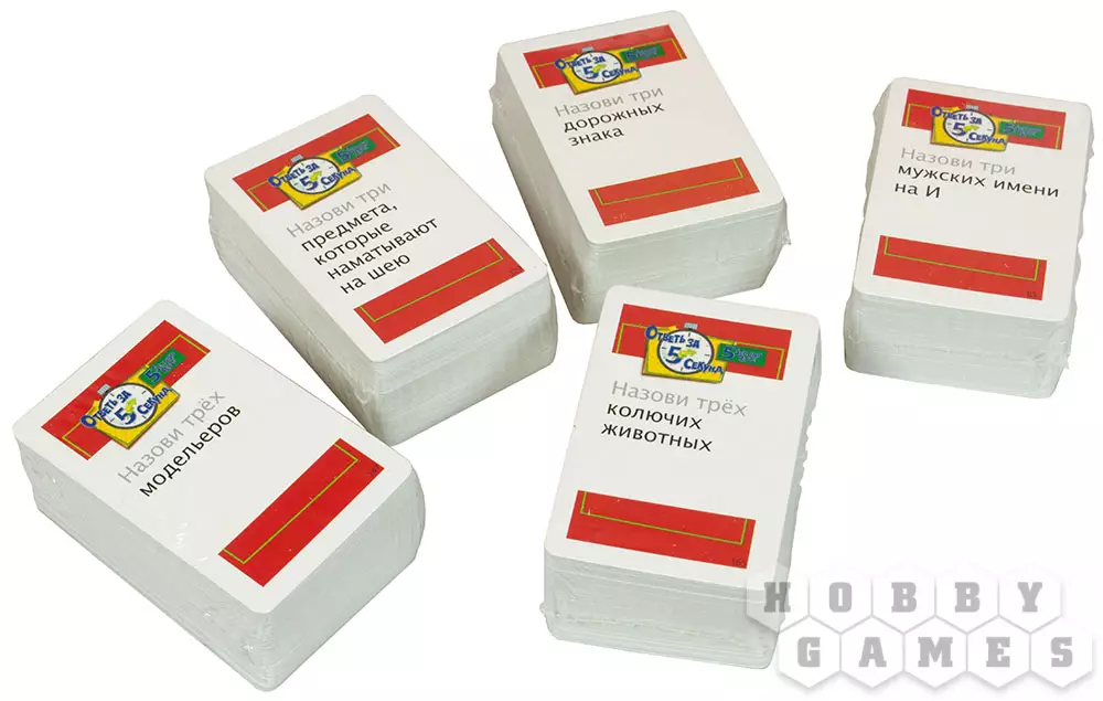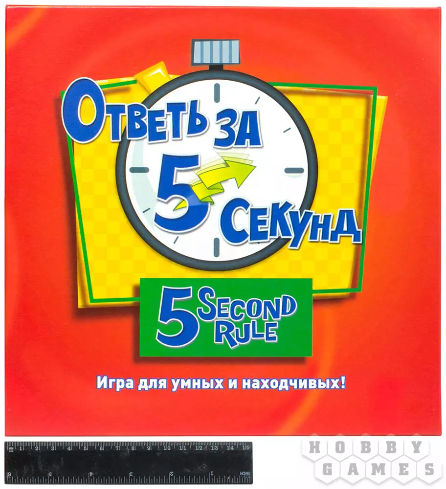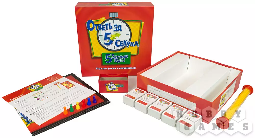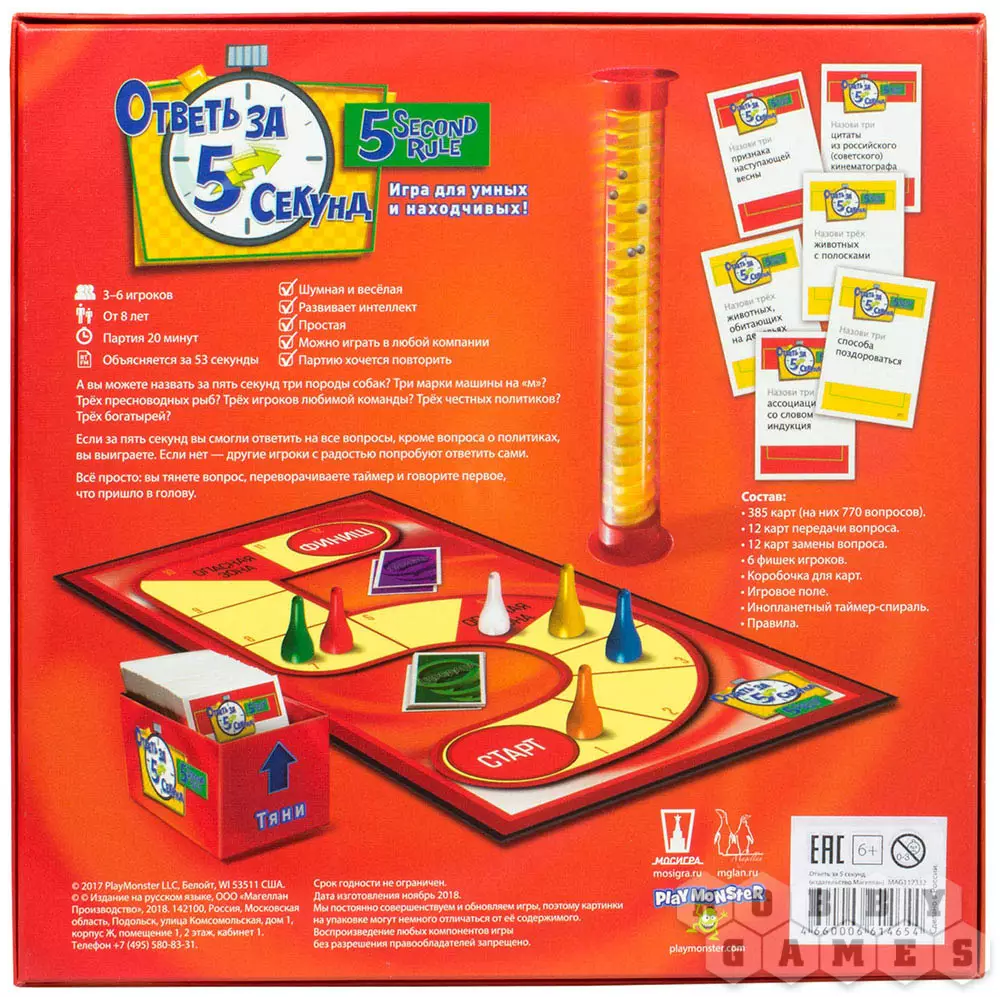 "Ответь за 5 секунд" – это быстрая и забавная викторина для весёлой компании. Правила крайне просты – нужно ответить на вопрос из карточки, и справиться с этим, как нетрудно догадаться из названия, за пять секунд. Для удобного контроля времени в комплекте с игрой вы найдёте забавный таймер-спираль с железными шариками внутри.