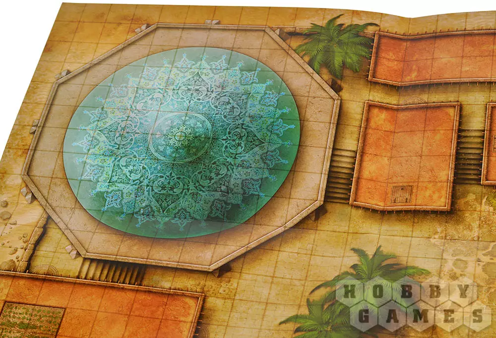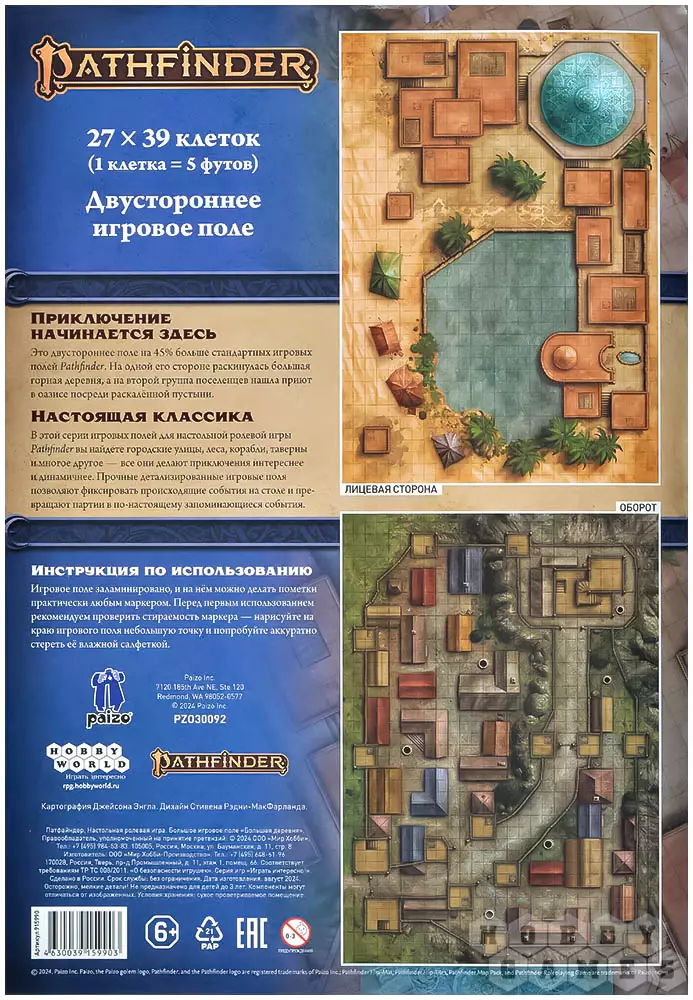 На одной стороне вам открывается горная деревушка с каменными тропками и геометричными домиками, а на другой – стоянка посреди горячих песков пустыни с оазисом. Обе иллюстрации позволяют разыгрывать множество различных игровых ситуаций, а благодаря крупному формату (это поле на 45% больше стандартных полей Pathfinder!) вы сможете эффективно использовать каждый его сантиметр и просто получать эстетическое удовольствие.