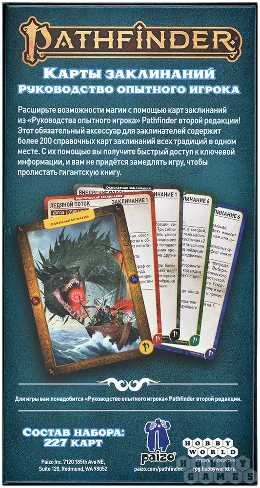 Чтобы узнать важную информацию, больше нет необходимости страницу за страницей листать громадную книгу правил и искать "то самое" заклинание! Благодаря картам заклинаний из "Руководства опытного игрока" Pathfinder, ваши магические возможности вырастут в разы. Набор удобно помещается в руке и содержит не менее двухсот карт со справочной информацией по заклинаниям всех традиций!