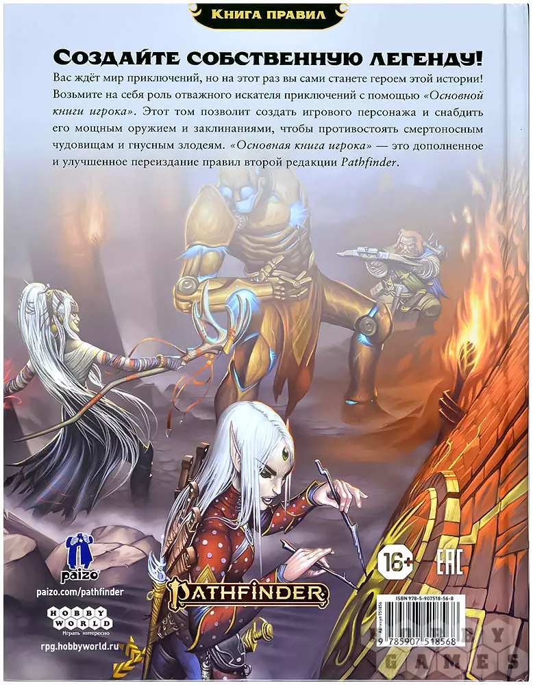 Масштабный мир Голариона ждёт появления новых героев, готовых творить историю, менять устои и совершать подвиги, о которых будут слагать легенды! И, конечно же, эти герои вы – отважные мечтатели и искатели путешествий. В ваших сердцах пылает огонь, а глаза светятся готовностью исследовать.В мире Pathfinder вы сможете побывать как в оживлённых городах и деревеньках, знакомясь ближе с культурой и традициями этой фэнтезийной вселенной, так и в отдалённых уголках, кишащих опасностями, а то и не одной. Мрачные пещеры, полуразвалившиеся замки, древние народы, обезумевшие правители – всё это и не только может встретиться вам на пути. С помощью "Основной книги игрока" вы создадите того самого идеального персонажа, который будет способен противостоять любому противнику и выбраться из любой передряги. Хотите владеть магией? Или больше доверяете холоду и тяжести стали в своей руке? А может, не хотите ограничивать себя и возьмёте и то, и другое? Почему бы и нет. Скорее продумывайте своего героя и отправляйтесь в путь!