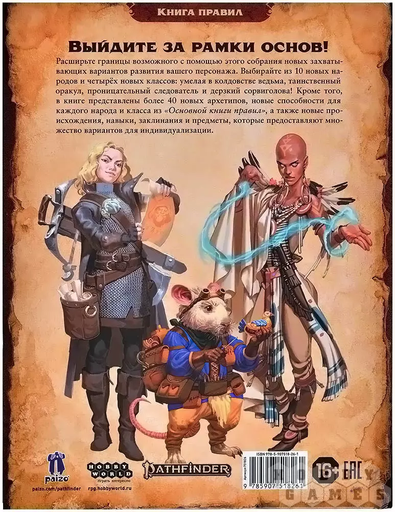 "Руководство опытного игрока" для второй редакции НРИ Pathfinder – это книга, которая позволит вам расширить границы возможного! В ней вас ждёт не только большое количество информации о новых возможностях развития, но и другие, ещё неизведанные пути становления персонажа. 10 новых народов и 4 дополнительных класса дадут вам ещё большую свободу при создании персонажа. Всегда хотели быть ведьмой? Пожалуйста! Мечтали примерить на себя роль оракула? Такое теперь тоже можно!