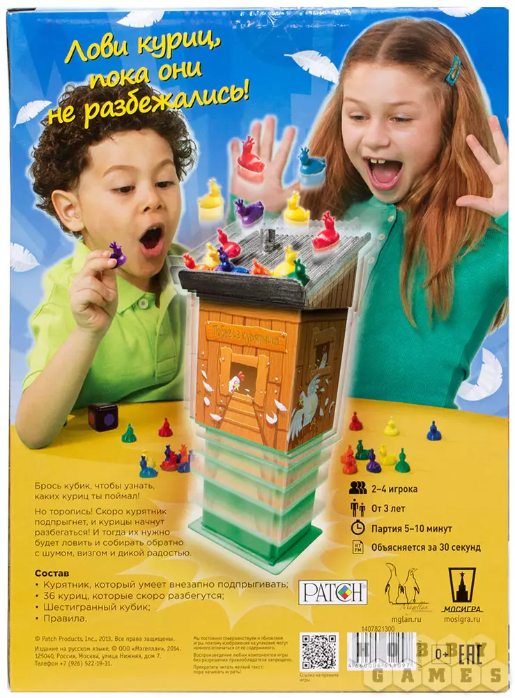 Ловите курочек, а то они разбегутся в разные стороны! "Побег из курятника" – это безумная настольная игра, в процессе которой вам нужно избавиться от всех ваших куриц, пока они не сбежали. Невероятный прыгающий куриный домик станет эпицентром веселья, а тридцать шесть куриц будут из него убегать.