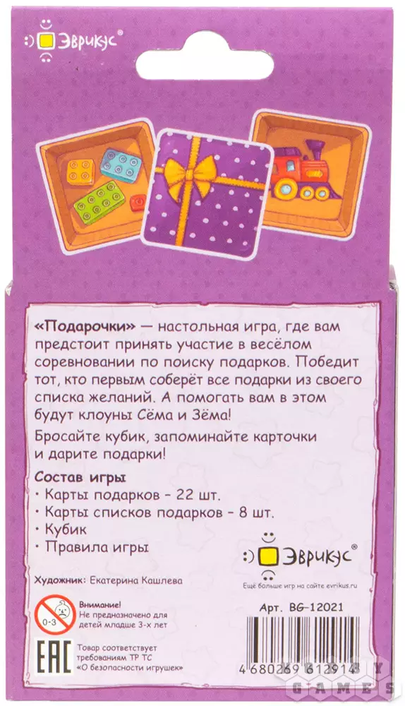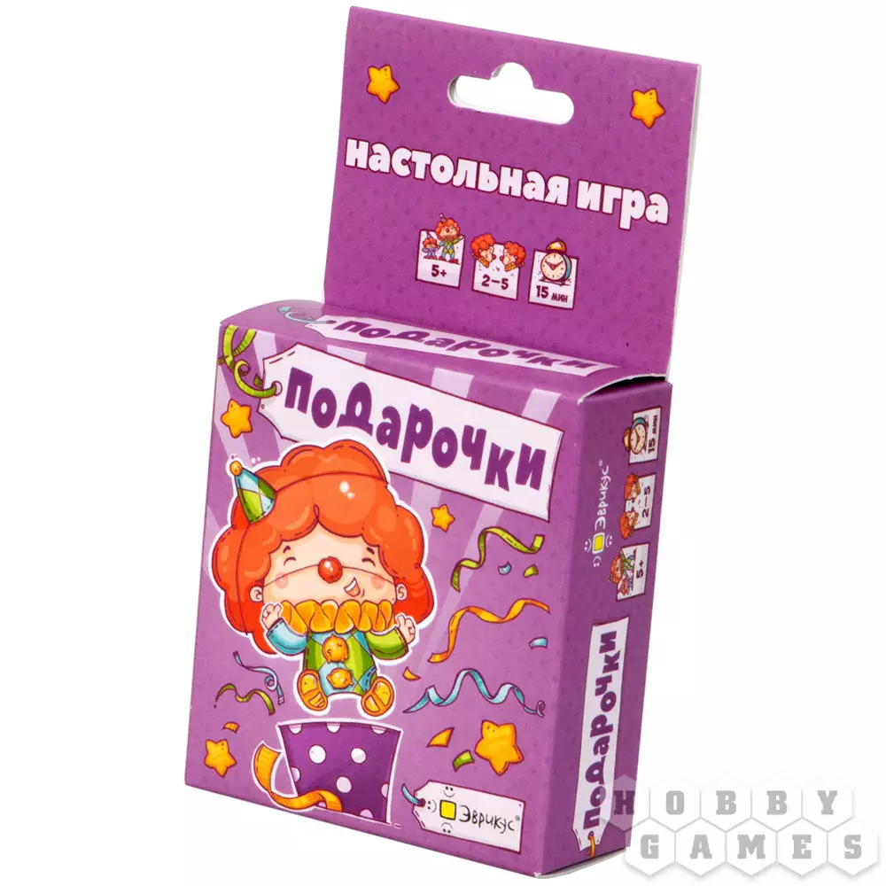 Каждый о чём-то мечтает, а в игре "Подарочки" от издательства "Эврикус" для самых маленьких настольщиков можно исполнить свои мечты и получить все пункты из списка желаний – при помощи весёлых Сёмы и Зёмы, неунывающих клоунов, которые просто обожают дарить подарки. Кидайте кубик, запоминайте выпавшие подарки и не выбирайте пустые коробки!