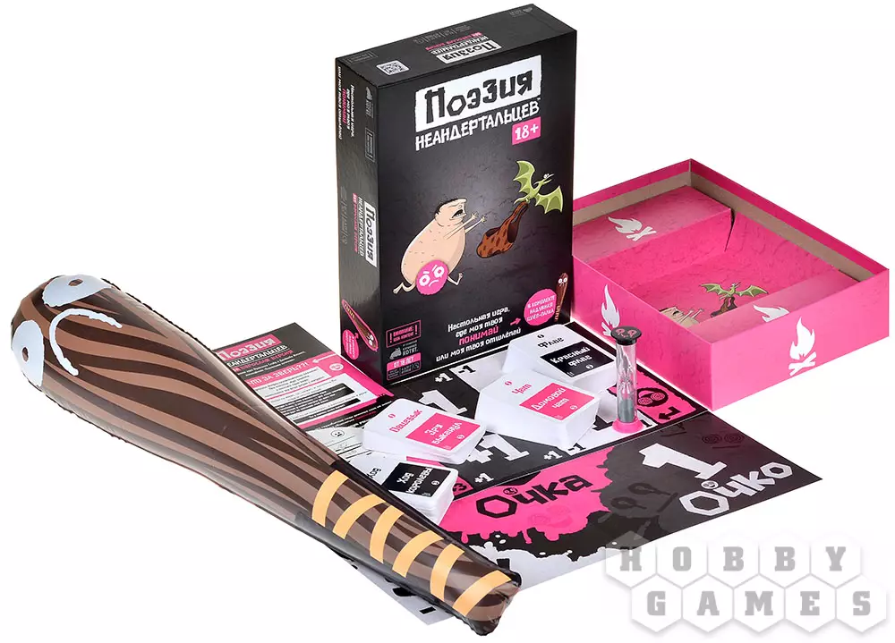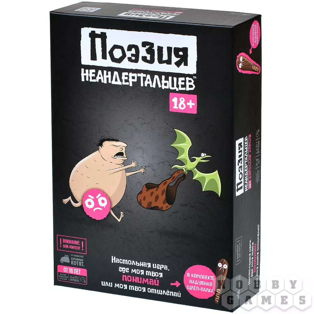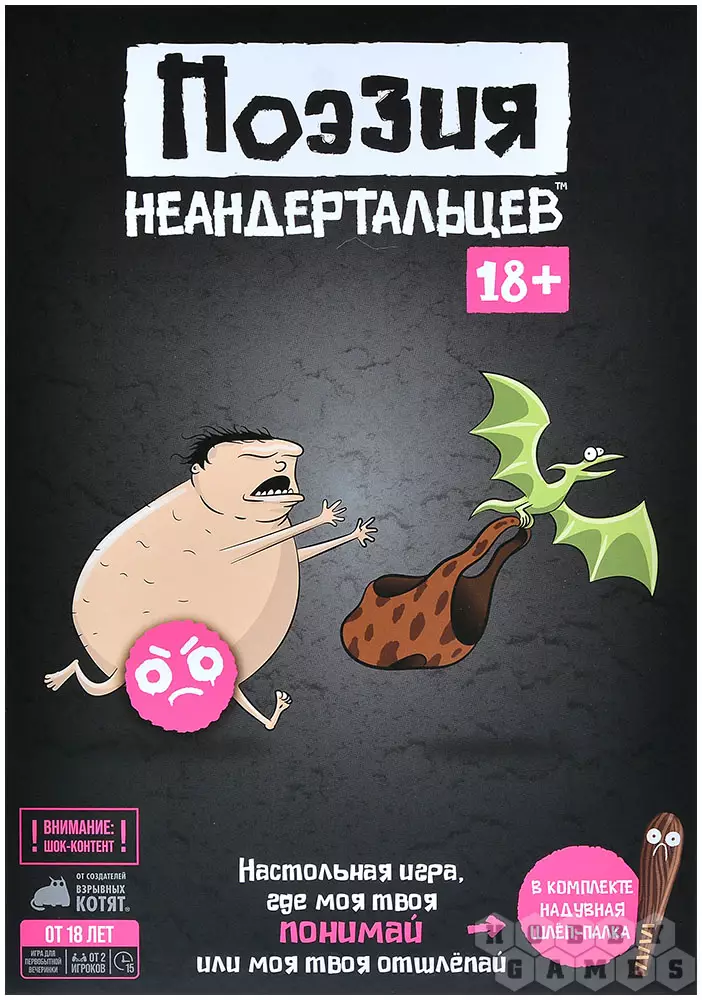 "Поэзия неандертальцев 18+" – это версия весёлой вечериночной игры "Поэзия неандертальцев" (без цифр). Что это значит? Это значит будьте готовы ко всякой первобытной нецензурщине, которую совершенно точно не стоит слышать деткам, зато вполне можно слышать на уже взрослой вечеринке. И не только слышать, но и объяснять! Только обязательно односложными словами, потому что, сами понимаете, речь пещерных людей была невероятно экспрессивная и необычная, но лишённая всяких вот этих дурацких сложностей в виде двух, трёх или и того больше слогов. И если вдруг из вас случайно вырвется человек начитанный вместо человека неандертальского, то будьте готовы схлопотать по маковке шлёп-палкой! И неприятно, и грустно, и очков победных не достанется. Не приведи динозавр, ещё за детский стол отсадят... В общем, сделайте всё, что в ваших силах, чтобы доказать: ваше племя – эксперт по всяким похабным словечкам и с гордостью готово это признать!