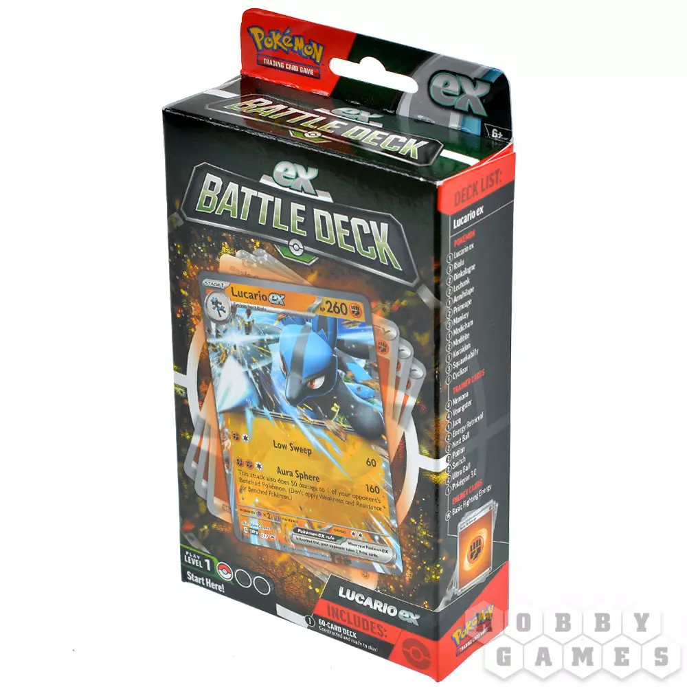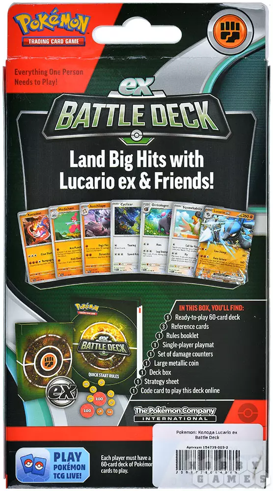 В этой колоде собралась целая команда мощных покемонов боевого и обычного типов. Возглавляет их Lucario ex, взгляду которого подвластны чужие ауры. Это знание делает Lucario ex искусным бойцом, ведь оно позволяет считывать эмоции и намерения соперника, а также управлять энергетическими волнами и наносить огромный урон. В колоде содержится 60 карт и ряд аксессуаров, которые позволят вам сразу окунуться в мир сражений сразу, не теряя ни одной лишней секунды на дополнительную подготовку. Так, внутри Lucario ex Battle Deck вы найдёте счётчики урона, игровой коврик, металлическую монету и другое. Атакуйте соперников энергией и побеждайте!