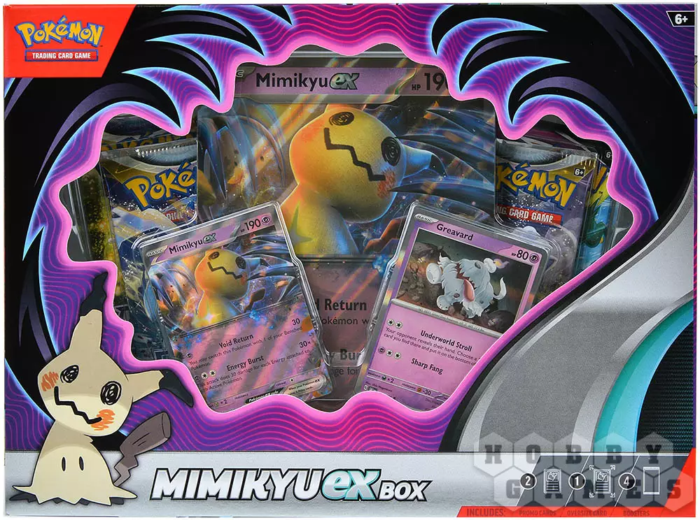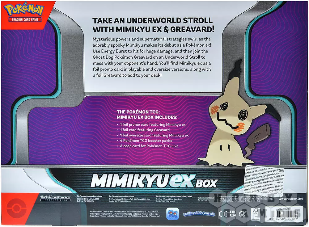 Таинственные способности и сверхъестественные стратегии проявляются, когда очаровательно жуткий Mimikyu выступает на поля боя! Используйте энергетический взрыв, чтобы наносить противникам огромный урон, а затем пустите в ход покемона Greavard, чтобы спутать карты своему оппоненту. Вы найдете Mimikyu ex в виде фойловой промокарты и oversize карты.