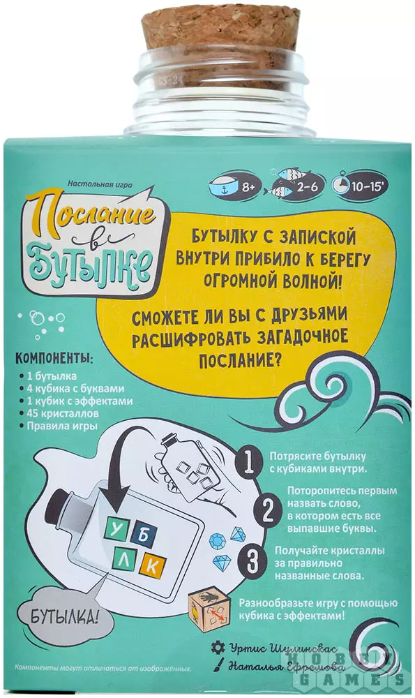"Послание в бутылке" – это прекрасная игра на эрудицию, отлично подходящая для компаний, желающих проверить свой интеллект. Правила безумно просты: трясите бутылку с кубиками и придумывайте слова, в которых будут содержаться все выпавшие буквы. Удалось? Берите победный кристалл! Совершили ошибку? Увы, с одним из накопленных кристаллов придётся распрощаться. А чтобы было ещё веселее, пробуйте разные режимы игры – благо, их предусмотрено достаточно! Ваша цель – набрать 8 кристаллов и стать мастером эрудиции!
