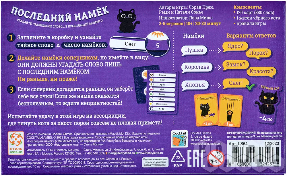Ваша задача – догадаться, какое слово скрыто на карточке у ведущего за точное количество намёков. Правила просты и будут понятны любому, но загвоздка в том, что участники должны разгадать тайное слово ровно за указанное количество намёков, известное одному лишь ведущему. Не дайте догадаться слишком быстро, но и не допустите, чтобы его вовсе не угадали!