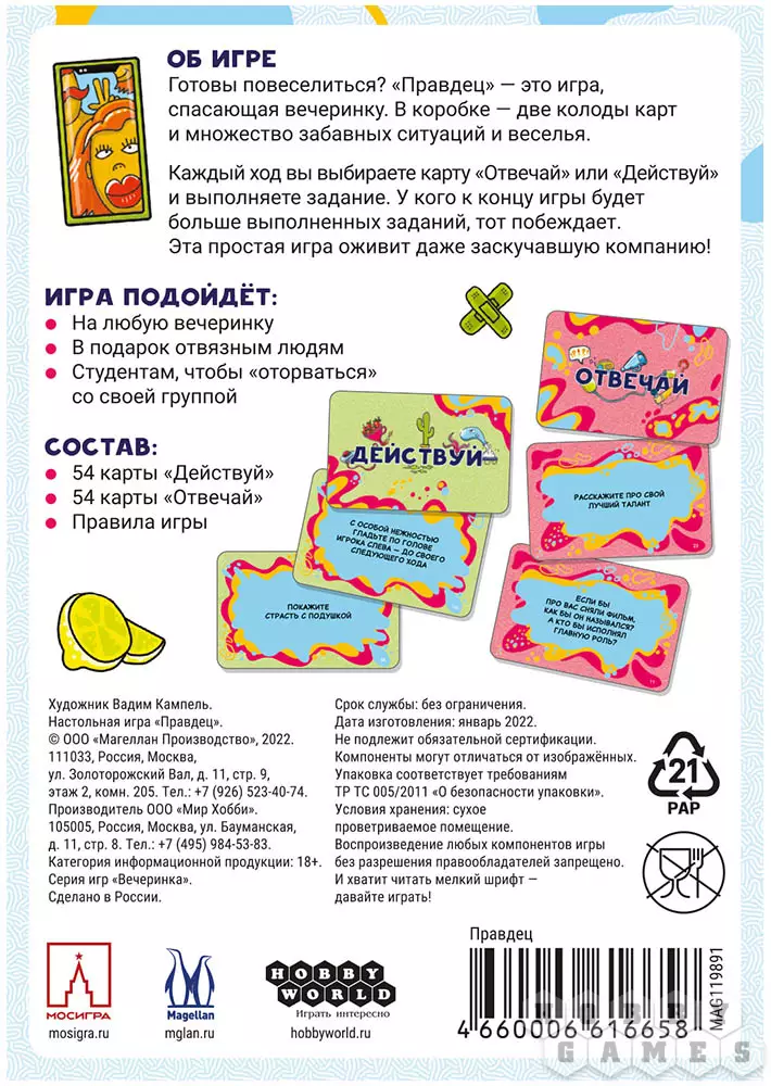 Правила вечериночной настолки "Правдец" крайне просты – каждый игрок в свой ход выбирает одну из колод, берёт карту, после чего, прочитав задание, выполняет его. Если всё получилось, закидывайте в копилочку одно победное очко и передайте ход дальше. Ну а если с выполнением задания возникли какие-то трудности, в виде штрафа (ну а кому-то, может быть, и наоборот) придётся махнуть рюмашку, или иными словами, выпить (напоминаем о чрезмерном употреблении горячительных напитков).