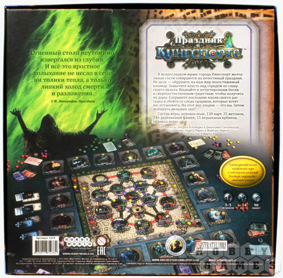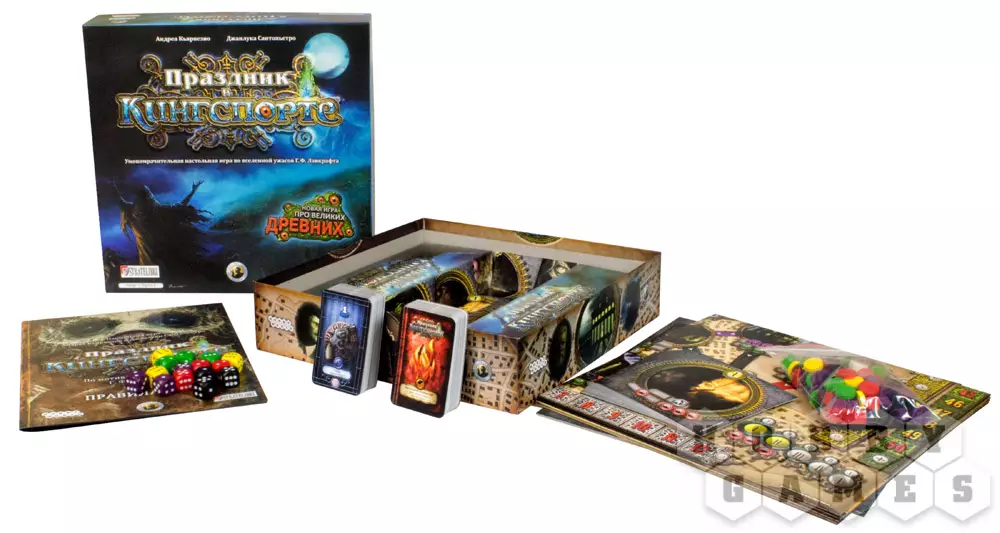 "Праздник в Кингспорте" – настольная игра для 3–5 игроков по мотивам мрачных произведений Говарда Филлипса Лавкрафта. Игрокам предстоит стать верховными жрецами зловещих культов, стремящихся захватить власть над городом. Да, на этот раз игра в знакомом сеттинге не кооперативная, а каждый игрок-культист будет стремиться лишь к своему величию!