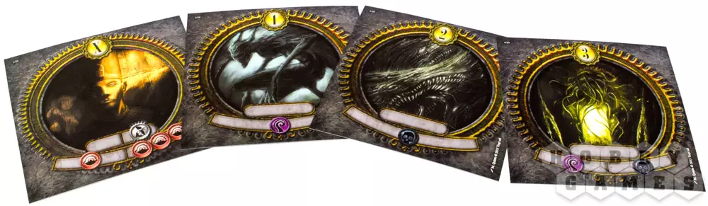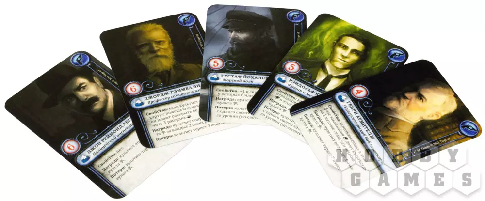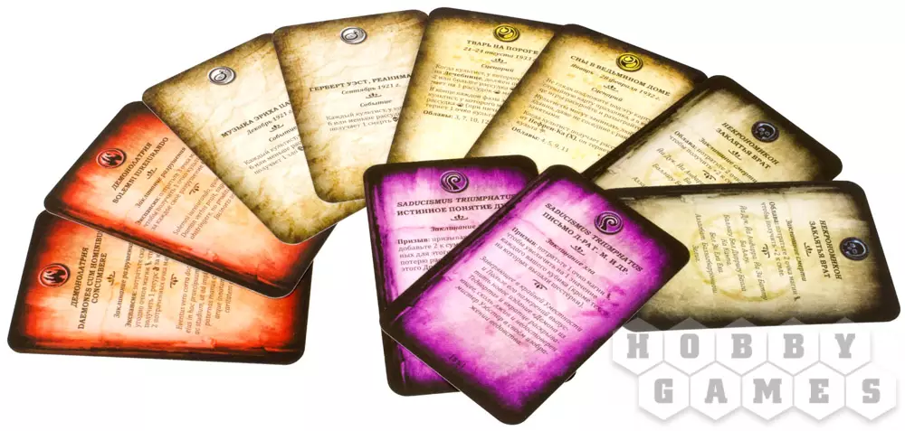 110 карт, а именно: 24 сыщика четырёх разных уровней, 45 заклинаний трёх разных типов,12 сценариев, 18 событий, 6 праздников и 5 памяток