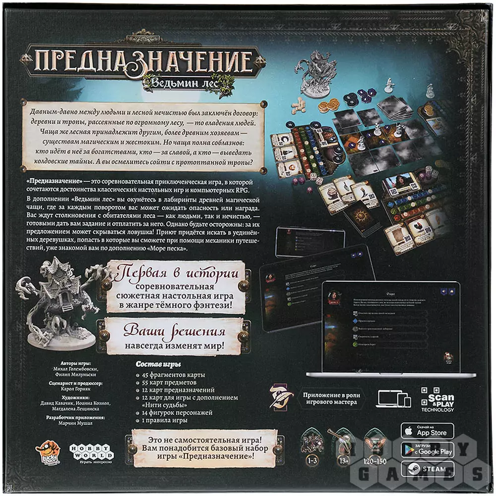 В дополнении "Ведьмин лес" к настольной игре "Предназначение" игроки отправляются в глубины магического леса, где каждый шаг ведёт к неизвестности. Древняя чаща населена существами, с которыми можно вступить в сделку, выполнить их задания или столкнуться с последствиями собственных решений.