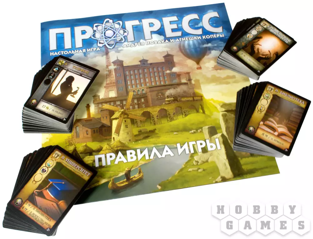 "Прогресс" это карточная игра, которая рассказывает о развитии технологий на протяжении практически всей истории человечества. Игрокам, соответственно, предстоит построить самую технологически развитую цивилизацию, при этом конкурируя друг с другом. Вам предстоит пройти путь от первых творений человечества через античность, средние века и эпоху Возрождения до первых искр промышленной революции (а с дополнением даже немного дальше)! При этом всего в игре три различных ключевых области прогресса – это наука, техника и искусство. Грамотно развивая различные технологии и правильно выбирая стратегию, вы приведёте свою нацию к победе!