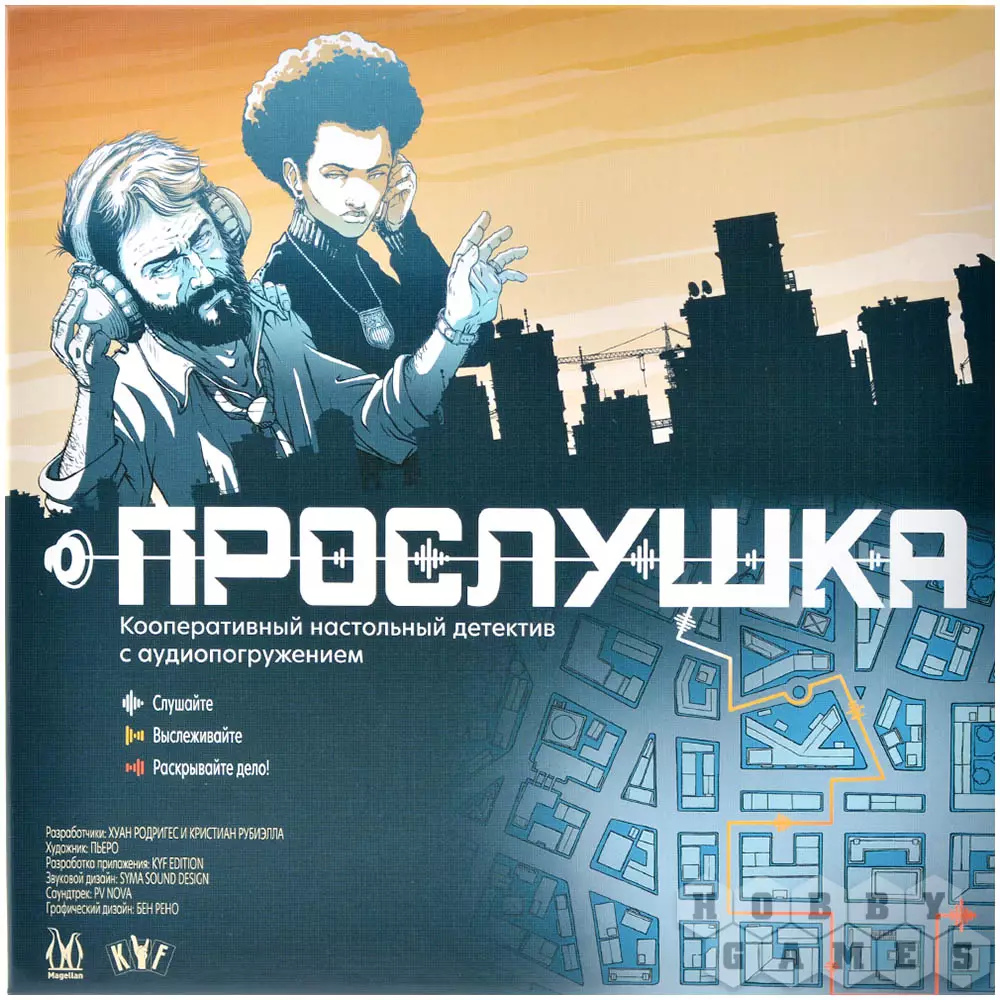 "Прослушка" – это кооперативный настольный детектив, в котором вы и ваши друзья станете следователями особого аудиоотряда. Совместными усилиями вам предстоит провести 15 уникальных расследований, входящих в данную коробку, чтобы вычислить преступников. Но вы сможете раскрывать преступления и в одиночку, если ваши напарники уехали в офис и оставили в отделе одного.