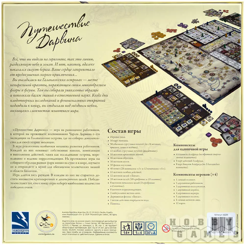"Путешествие Дарвина" – стратегическая настольная игра для 1-4 участников, в которой вы управляете экспедицией, нанимаете ассистентов, исследуете регионы, собираете редкие образцы и создаёте научные труды. Механика построена на евро-принципах: менеджмент ресурсов, планирование действий и развитие собственной лаборатории. Ассистенты – зоологи, ботаники и другие специалисты – помогают вам открывать новые виды и продвигаться по следу Дарвина. Каждый ваш шаг приближает к победе, но и соперники не дремлют. Пути к успеху разнообразны – выбирайте стратегию, развивайте теории и наблюдайте, как маленькие детали складываются в великое открытие.