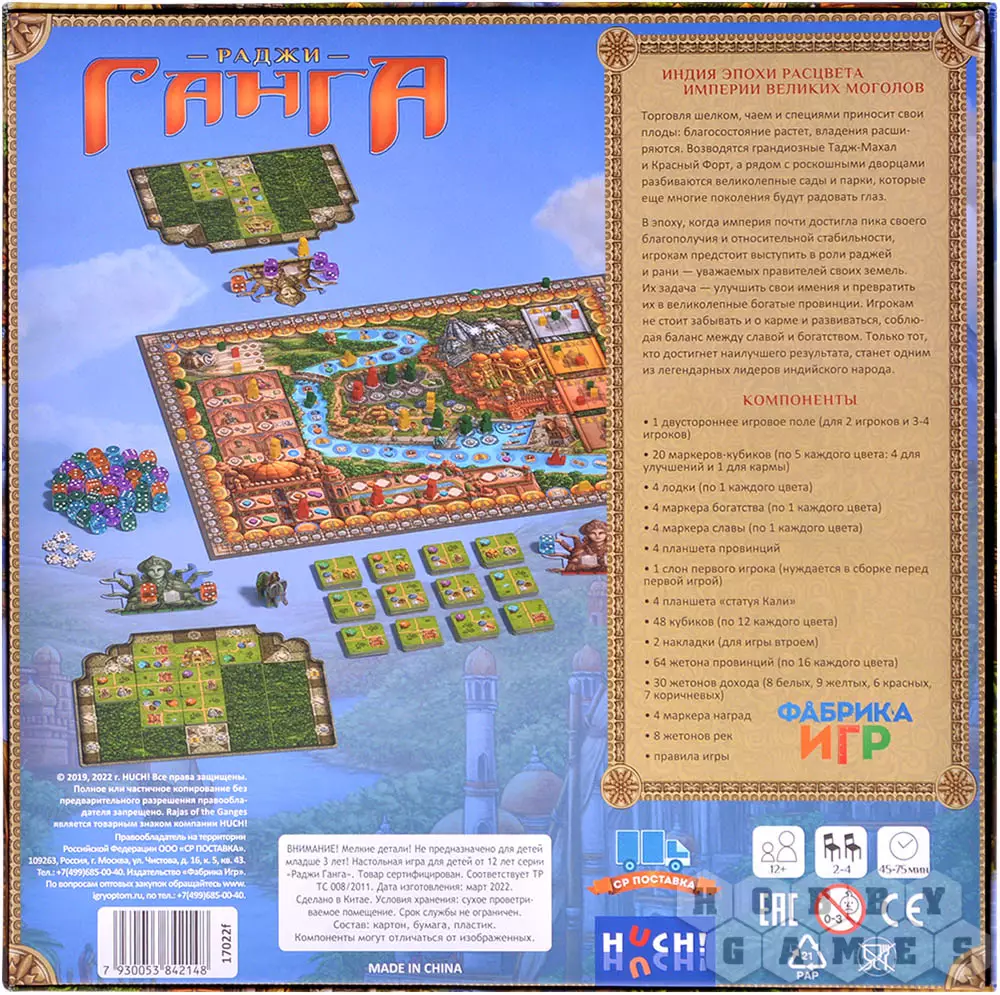 Именно в эту эпоху погружает настольная игра "Раджи Ганга". Игроки примут на себя роль уважаемых правителей своих земель – раджей и рани. Но это уважение невозможно без должной работы, поэтому задачей игроков становится развитие своих территорий из личных имений в потрясающие богатые провинции. Игра длится на протяжении нескольких раундов, в течение которых игроки будут размещать своих рабочих на различные участки игрового поля. Хотите получить больше монет? Отправьте рабочего торговать на рынок. Нужна поддержка? Загляните во дворец Великих Моголов. Получили всё необходимое для облагораживания своей провинции? Пусть рабочие отправляются в карьер и начинают строительство храма.