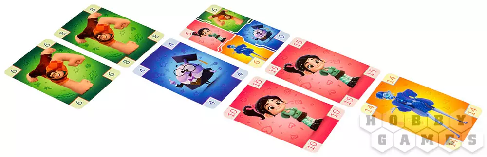Каждый игрок получает на руки двенадцать карт. На картах могут быть изображены различные персонажи мультфильма – это Ральф, Ванилопа, Всёузнай и Класс, а на карте джокера изображены сразу все персонажи. Это различные масти. Помимо этого, карты обладают различными номерами, которые определяют, в каком порядке будут разыгрываться карты.