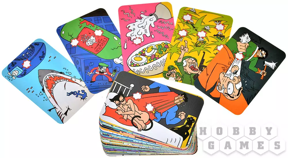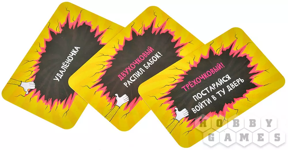 Ваша задача – по очереди брать смешные карточки из общей колоды, смотреть на них (напоминаем, что больше такой возможности не представится!), запоминать расположение очка, а затем безжалостно рвать! Но не абы как, а в соответствии с заданием, написанным на обратной их стороне, – так называемым "нюансом". Очко (такое белое облачко, похожее на взрыв) при этом обязательно должно быть разорвано, ведь в этом суть всей игры! Загвоздка в том, что делать это предстоит вслепую, пытаясь вспомнить все детали красочной картинки, которую вы до этого рассматривали. А под влиянием горячительного сделать это порой не так-то и просто. А уж если очко на карточке не одно...