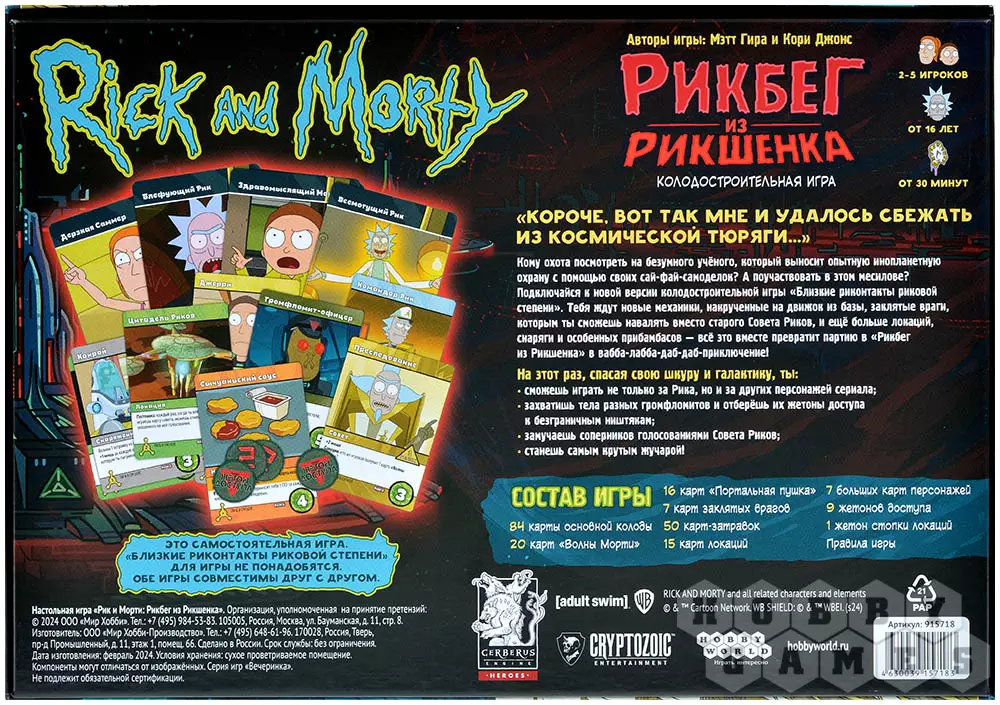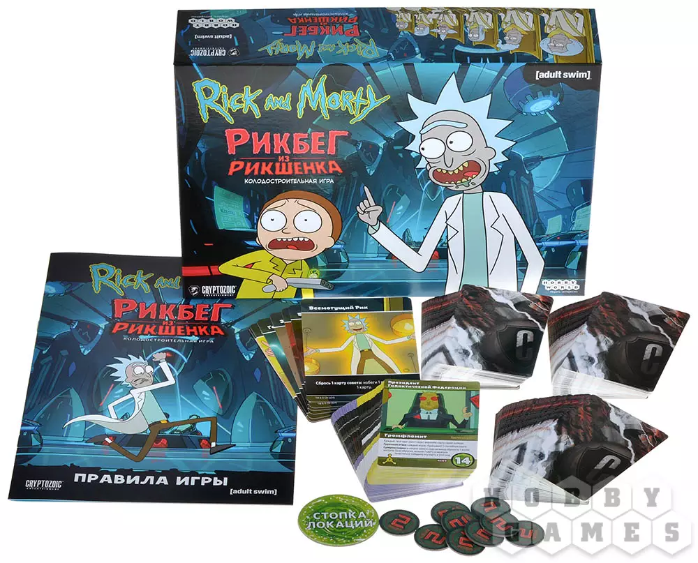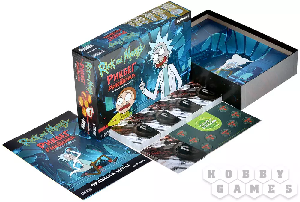 Если вы фанат мультсериала, то, конечно же, догадались, что действия настолки "Рик и Морти: Рикбег из Рикшенка" переносят нас в первую серию третьего сезона, в которой громфломиты пытаются вызнать у Рика секрет его портальной жидкости. Стоит отметить, что это – новая версия уже знакомой фанатам вселенной игры "Близкие риконтакты риковой степени", в которую были добавлены новые интересные механики. Они превращают колодострой в ещё более сумасшедшее развлекалово! Вам будут противостоять заклятые враги Рика, а поиграть можно будет за многих героев мультсериала. Захватывайте тела громфломитов, чтобы получать доступ к куче полезных ништяков, мешайте другим игрокам бесконечными голосованиями в Совете Риков и станьте самым крутым жучарой в этой настольной игре!