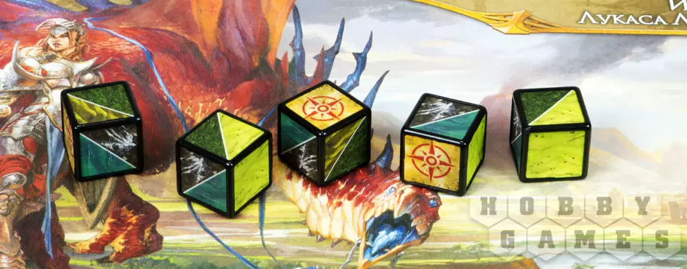 - Передвижение – вы можете либо перейти героем в соседнюю область, либо бросить походные кубики, причём чем больше ваша скорость передвижения, тем больше кубиков можно кинуть. Кубики укажут на те типы местности, которые вы сможете преодолеть в этот ход. Для захода в город или перехода через мост подойдут любые результаты