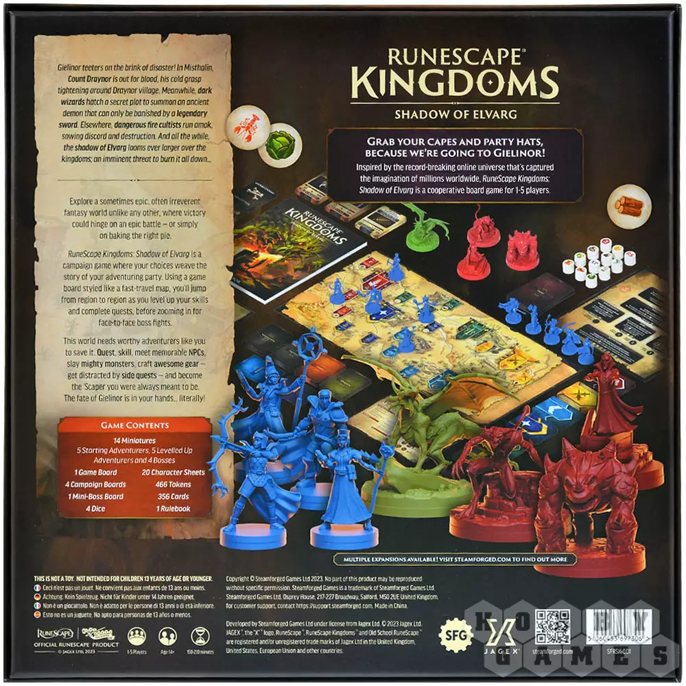 RuneScape Kingdoms: Shadow of Elvarg – это кооперативная настольная игра, основанная на вселенной компьютерной игры RuneScape. Создавайте свой класс (да-да, создавайте, а не выбирайте!), облачайтесь в снаряжение и отправляйтесь навстречу приключениям и увлекательным битвам с монстрами! Только не забудьте перед этим собрать себе компанию – группа до 5 человек включительно считается более чем подходящей для исследования этого мира. Хотя если вы по натуре загадочный одиночка, можете никого и не звать – так тоже сойдёт. Это настольное приключение состоит из разных кампаний, в каждой из которых вы сначала будете изучать тот или иной район игрового поля, а затем встретитесь с боссом, терроризирующим местных жителей! И если вы потратите слишком много времени на побочные квесты, они станут только злее... В общем, заскучать не получится!