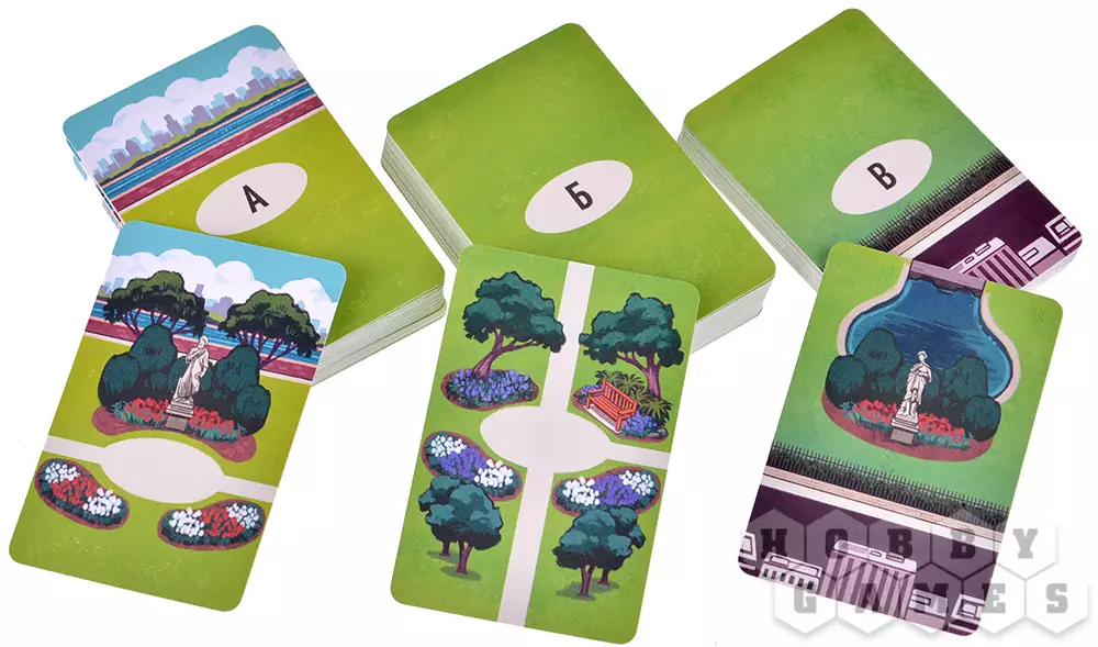 Ваша задача – создавать на своём планшете туристические маршруты при помощи карт, изображающих различные элементы парка. Рисунки на картах должны сочетаться друг с другом, а потому на ваших глазах будет возникать настоящее полотно с улочками, деревьями и арт-объектами. Игроки выкладывают карты по очереди, выбирая их из общего запаса в зоне рынка.