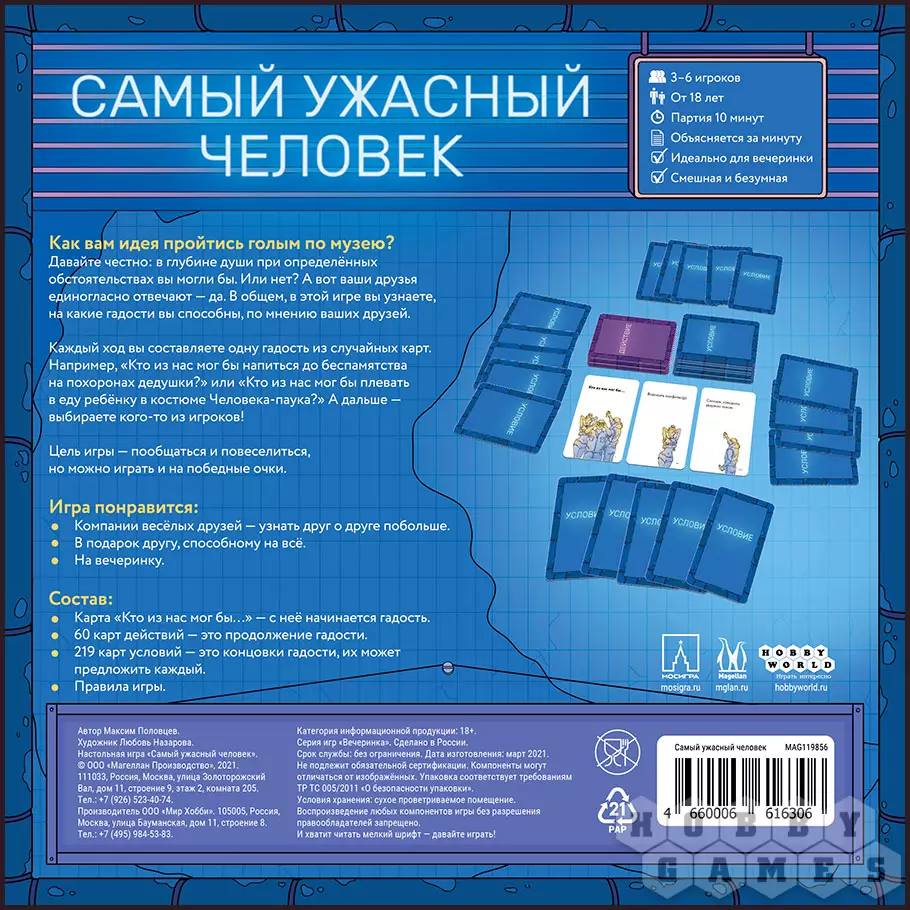 Насколько хорошо вы знаете своих друзей? А они вас? В настольной игре "Самый ужасный человек" участникам предлагается сознаться во всех тайных желаниях и проверить крепкие узы дружбы! Цель игры – общение, веселье и воображение. Каждый ход необходимо комбинировать карты, составляя нелепую гадость и затем выбирать игрока, который по вашему мнению смог бы совершить подобное. Например, пройтись голым по выставочному пространству или же в костюме супергероя испортить ребёнку мороженое!
