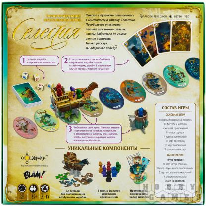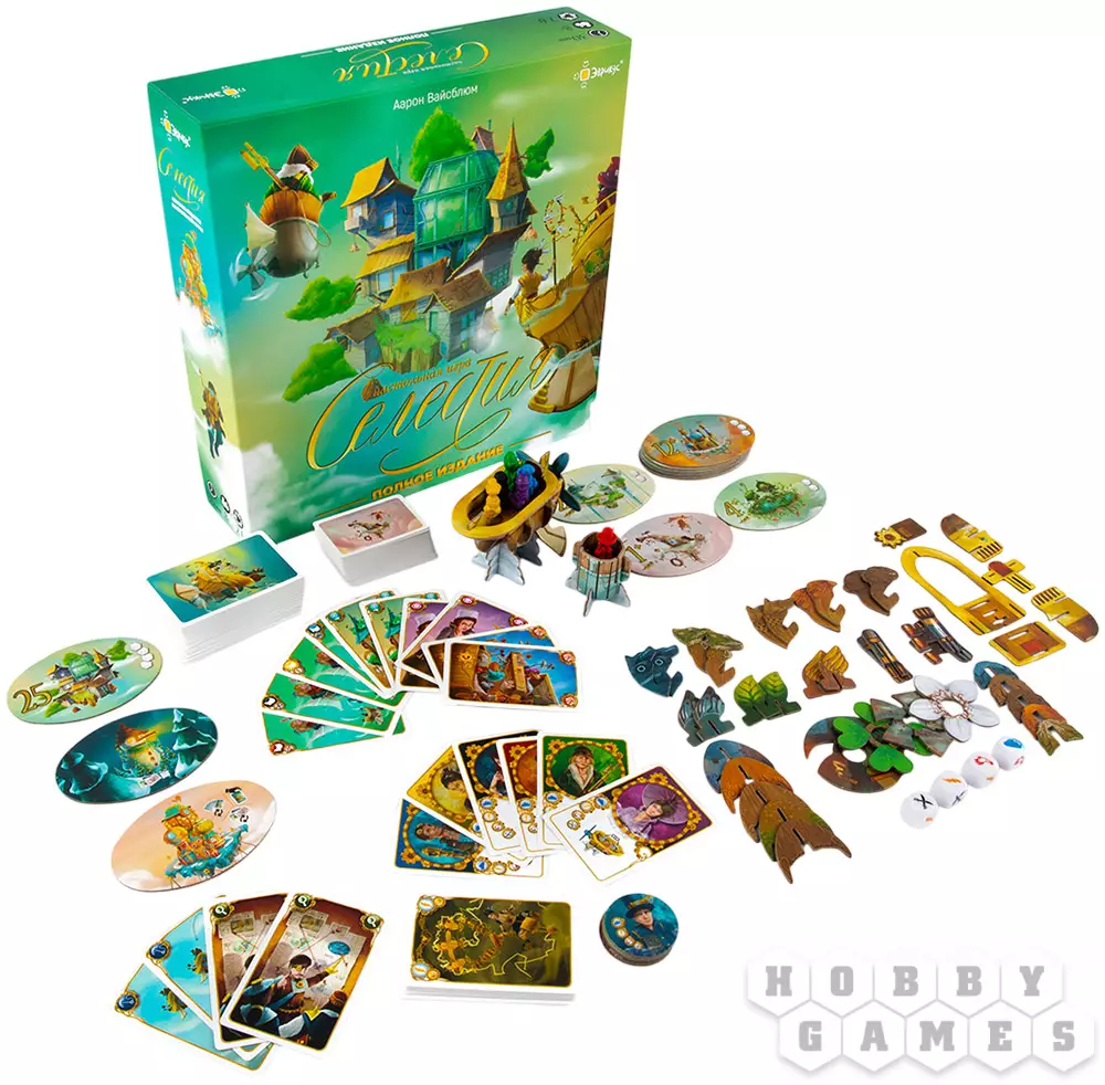 "Селестия: Полное издание" – это увлекательная настолка, сочетающая стратегию, блеф и командное взаимодействие. В этом издании собраны база, оба дополнения ("Рука помощи" и "Бунт на корабле"), промо-материалы, а также специальные правила для игры дуэтом. В коробке вас ждёт всё необходимое для захватывающего приключения – и даже сборный воздушный корабль, который можно украсить наклейками. Основная механика игры построена на выборе: остаться на корабле, рискуя ради более ценных сокровищ, или сойти в ближайшем городе, чтобы гарантированно получить награду. Капитан должен преодолевать препятствия, используя карты снаряжения, а пассажиры – решать, доверять ли ему.