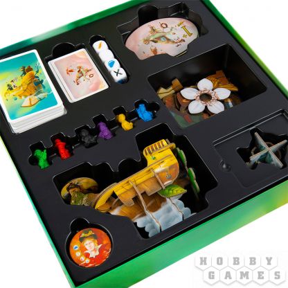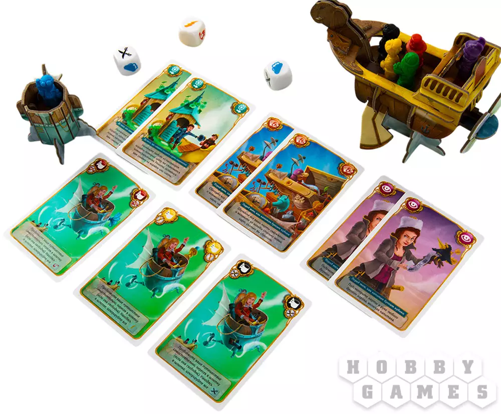 Подготовьте карты сокровищ, разложите города и поставьте корабль на старт! Каждый раунд – это новое испытание: капитан бросает кубики, определяя препятствия, а пассажиры решают, лететь дальше или сойти. Если капитан преодолеет все трудности, корабль двинется к следующему городу, и сокровища станут ещё ценнее. Если нет – крушение вернёт всех на старт! Используйте карты снаряжения, турбо-ускорения и специальные способности, чтобы перехитрить соперников. Дополнения добавляют новые возможности: например, карты "Рука помощи" спасут корабль от крушения, а шлюпка позволит отправиться в самостоятельное путешествие.