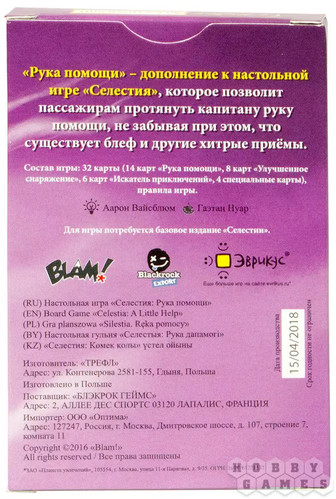 "Рука помощи" – дополнение к игре "Селестия". В этой игре вы путешествуете между городами на летающем корабле. Во время путешествия экипажу придётся сталкиваться с различными опасностями, которые могут трагически оборвать полёт. В базовой игре бремя решения всех проблем ложилось на игрока, которому на этот рейс досталась роль капитана. Остальным же оставалось либо слепо верить в успех, либо бежать с корабля. Теперь же у каждого члена экипажа есть шанс протянуть капитану руку помощи, чтобы увеличить общие шансы добраться до другого города в целости и сохранности. С другой стороны, если игроку нечего терять, то он может и саботировать полёт, чтобы после крушения все остались с пустыми карманами!